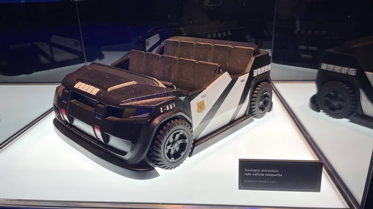 We did not get any early news dumps from Disney Parks Chairman Josh D'Amaro Thursday night. And there were no elements in the pavilion obviously covered up pending their reveal in D'Amaro session on Sunday morning. But we did get some nifty models of coming attractions, including this ride vehicle for the new Zootopia ride at Shanghai Disneyland.
