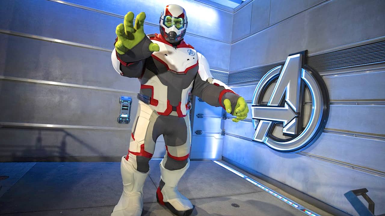 As you can see, Hulk is dressed in his Endgame time-traveling uniform, rather than appearing in his more familiar, shirtless form. This allows Disney to hide Hulk's face inside a helmet, where you cannot see if his lips are moving. Disney's Hulk character talks to guests visiting him in Avengers Campus, and the helmet costume allows Disney to not have to articulate Hulk's face and mouth, which it otherwise would have needed to do to make his speaking convincing.
