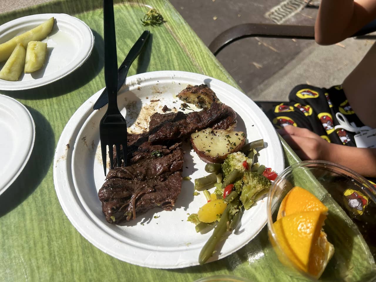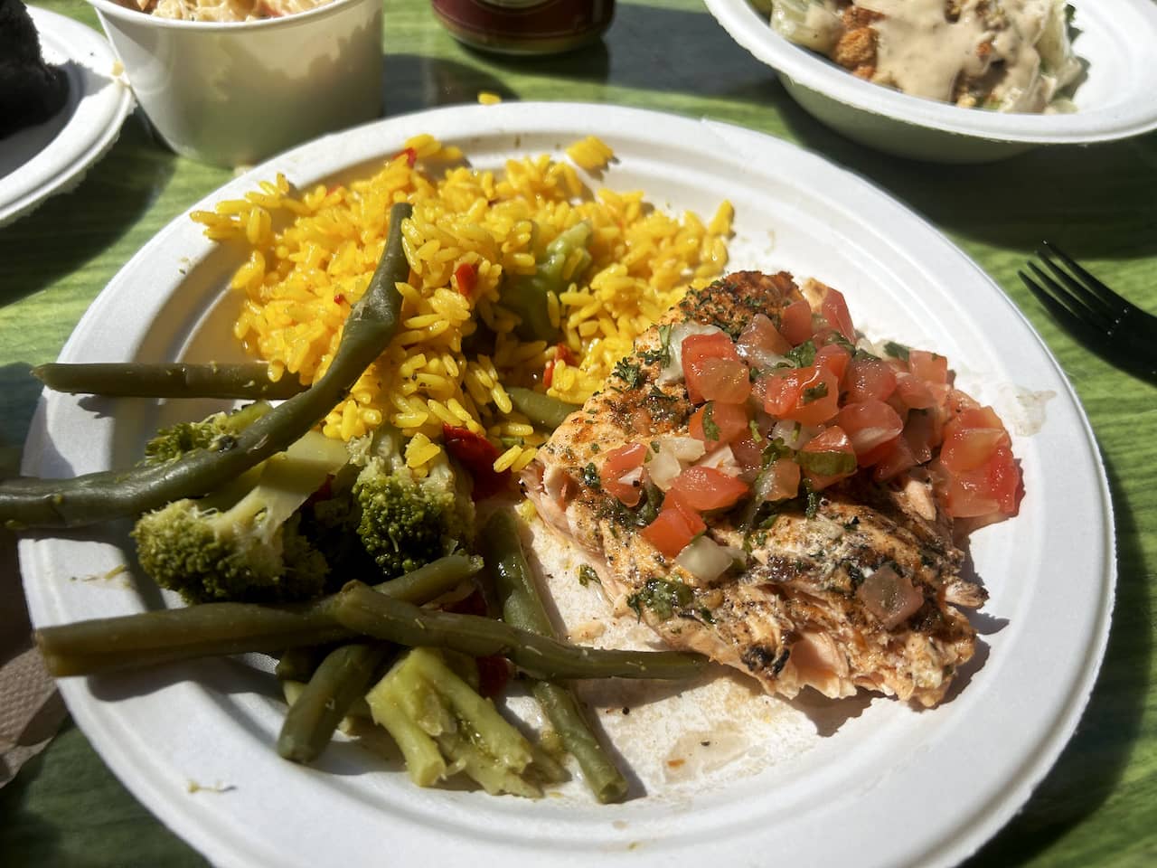 featuring two cafeteria-style service lines that provides breakfast items from 7:30-10:30 am and lunch items from 11:00am-3:30 pm. The food served at Laguna Grill is on par with what you would find at other SeaWorld and Busch Gardens parks, with plenty of options to satisfy a wide range of palates. I thought the breakfast was on par with a good hotel breakfast (French toast sticks, eggs, link sausage, waffles, yogurt, assorted fruit, etc.), while the lunch was above average compared to your typical theme park fare. (I had the grilled salmon plate, while my wife and son had the Brazilian-style flank steak plate.)
