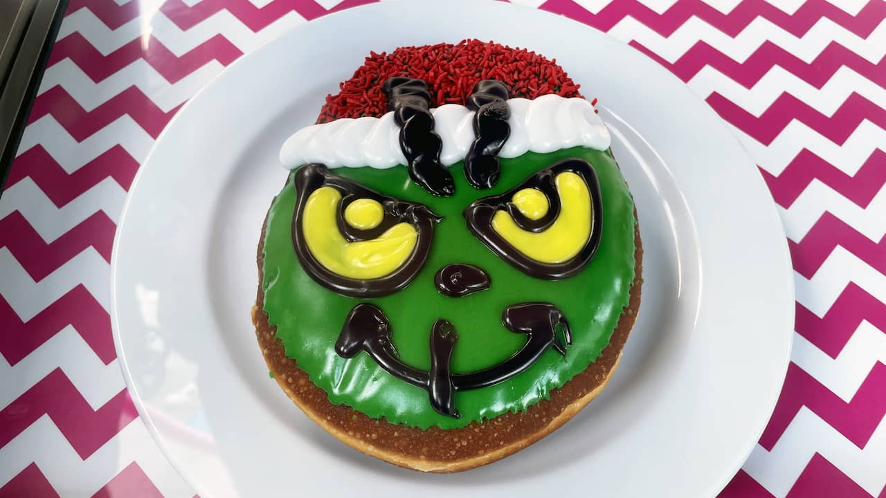 The holiday food offerings include a pumpkin-spice churro, various puddings and cakes in jars, hot chocolate plussed with a variety of alcohol or non-alcoholic flavors, and two contributions from the bakers over at Lard Lad Donuts: a chocolate Christmas wreath and a Grinch head doughnut, each in the ginormous size that Universal theme park fans seem to prefer. (No, I didn't try any of them. It's all going to taste like sugar - what else do you need to know?)
