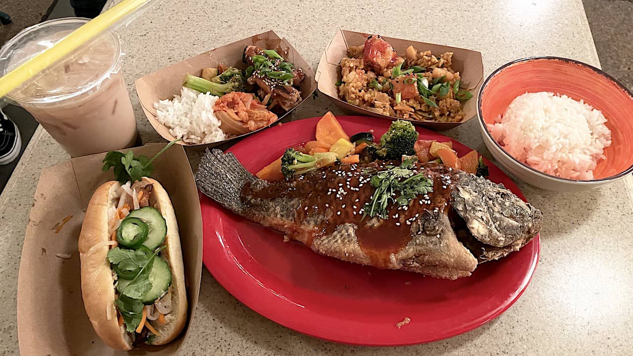 The plant-based Kimchi Bokkeumbap was our favorite item of the day, with a great mix of flavors and textures, topped with delightful sweet and sour tofu. I liked the barbecue chicken well eno.ugh, but it wasn't as flavorful as the chicken we'd had at lunch. The Bánh Mì is probably better at full size, as the tasting size had just too much bread versus fillings. The bread was fine, but the tasty pork belly just got lost here. The boba was a boba, the ubiquitous after-school drink for sugar- and caffeine-starved teenagers throughout Southern California.