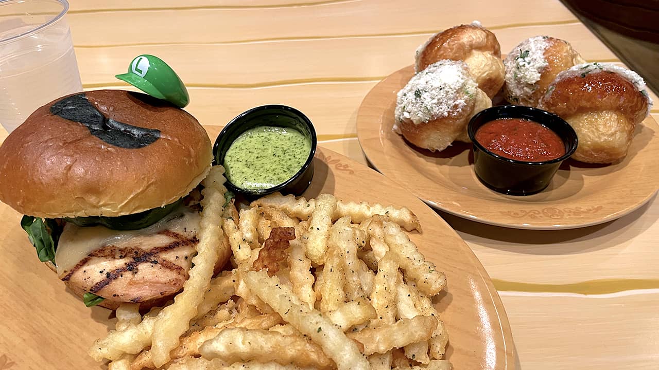 Unfortunately, the restaurant was out of the Mount Beanpole cake [now $9.99, along with the other two desserts: Question Block Tiramisu and Princess Peach Cupcake], so I could not try that. So I went with just the Toadstool Cheesy Garlic Knots [$5.99] and the Luigi Burger [$16.99] with grilled chicken, pesto, basil, green pepper, and Swiss cheese.