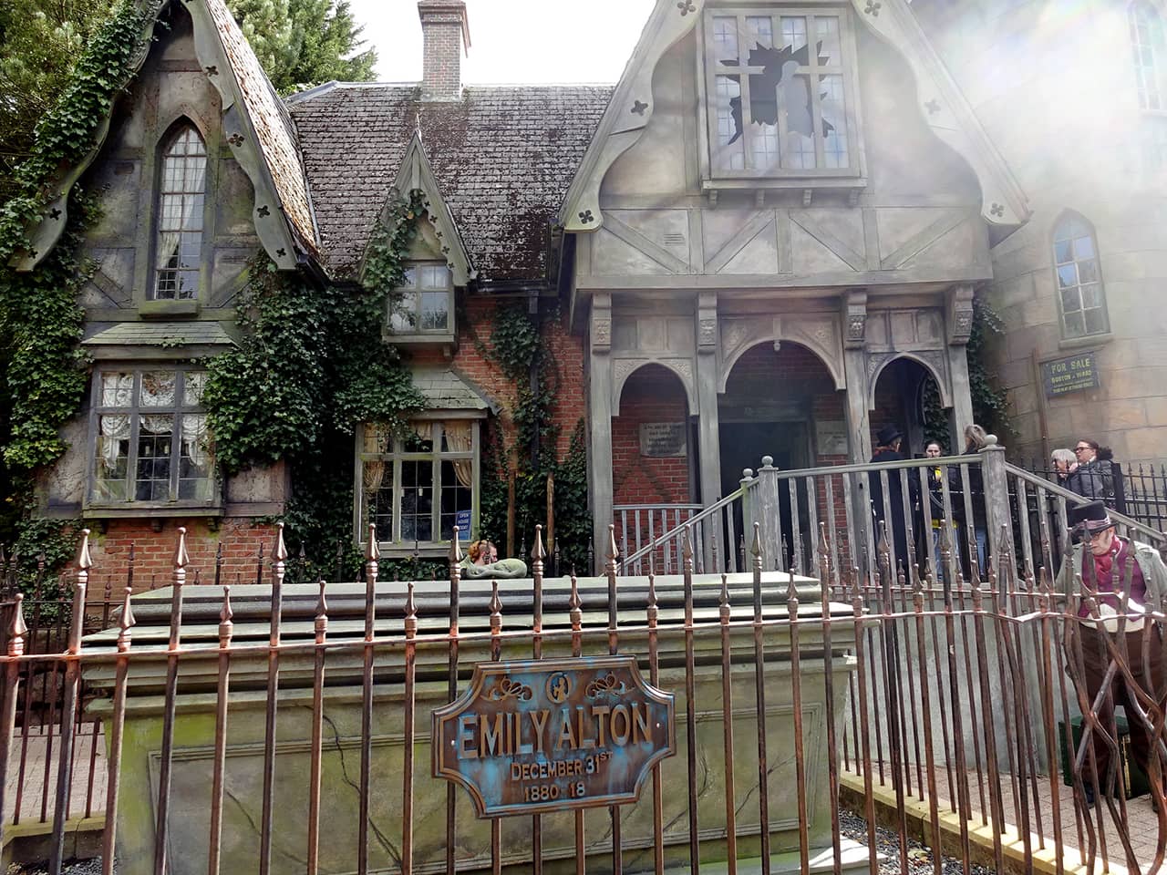 We eventually made our way to Curse of Alton Manor, a dark ride attraction that debuted this year with new theming centered around Emily Alton, a ghostly character that draws guests into her demented dollhouse. This ride has a bit of Haunted Mansion to it, utilizing tons of special effects, clever tricks, and forced perspective to make this attraction more like a classic haunted house than an attraction full of “happy haunts.”