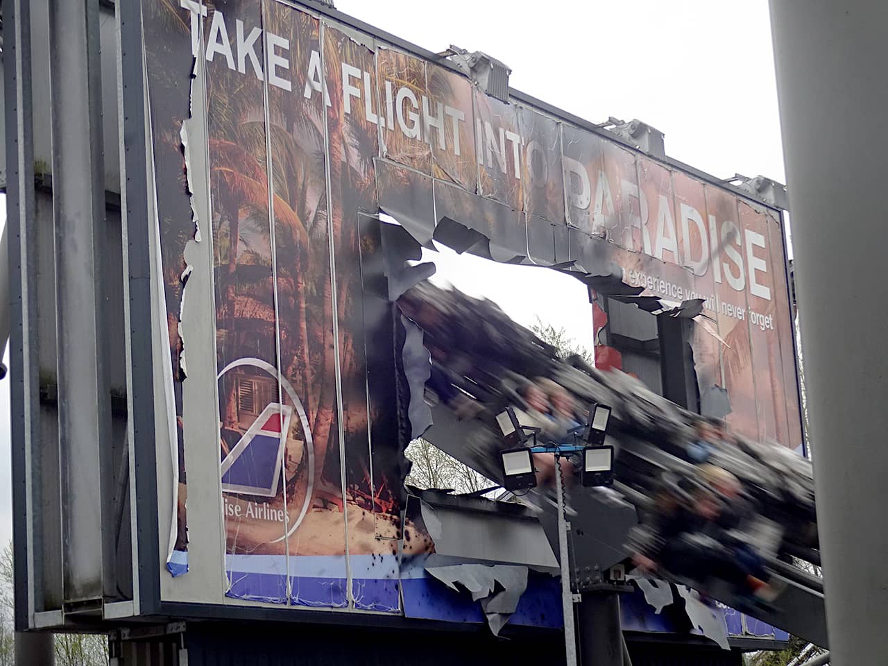 The attention to detail in the theming on Swarm is far beyond anything you would ever find at a Six Flags (includig Six Flags Fiesta Texas, which I feel is the best-themed SF park). Even the operators’ booth is themed by being housed in an upside-down ambulance perched above the loading platform. As with all B&M wing coasters, the line is split into two when you reach the station, to load seats on both sides of the track. Unfortunately, we were sent to the left side of the train for both of our rides but did get a chance to ride in the front row and near the back of the train to compare the experiences. I’ve ridden all of the wing coasters currently operating in the US (Gatekeeper, Wild Eagle, Thunderbird, and X-Flight), and like those installations, Swarm negotiates a course with massive, swooping motions, almost appearing in slow motion when watching from the ground. However, on board, the intensity remains high throughout, mostly accentuating positive Gs. Like other wing coasters, Swarm includes a number of near-miss elements, but here, props used to create those near-miss moments help to enhance the theming, like a billboard, a crashed airplane, and a hollowed-out church that houses the coaster’s station.