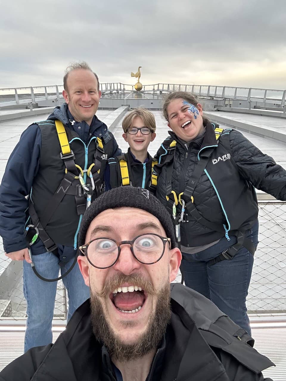 For more adventurous guests, you can add the Dare Skywalk to your stadium tour. After walking through all the public areas of the stadium, guests are outfitted with safety gear and shoes to make a walk along a steep exterior ramp to the stadium’s roof. Once you reach the top, guests clip into a safety line and are led on a narrow walkway that suspends them over the south end of the field, where the club’s golden cockerel is perched. We were fortunate to be led onto the Dare Skywalk by Jason, one of the experience managers, who was an amazing and enthusiastic guide.