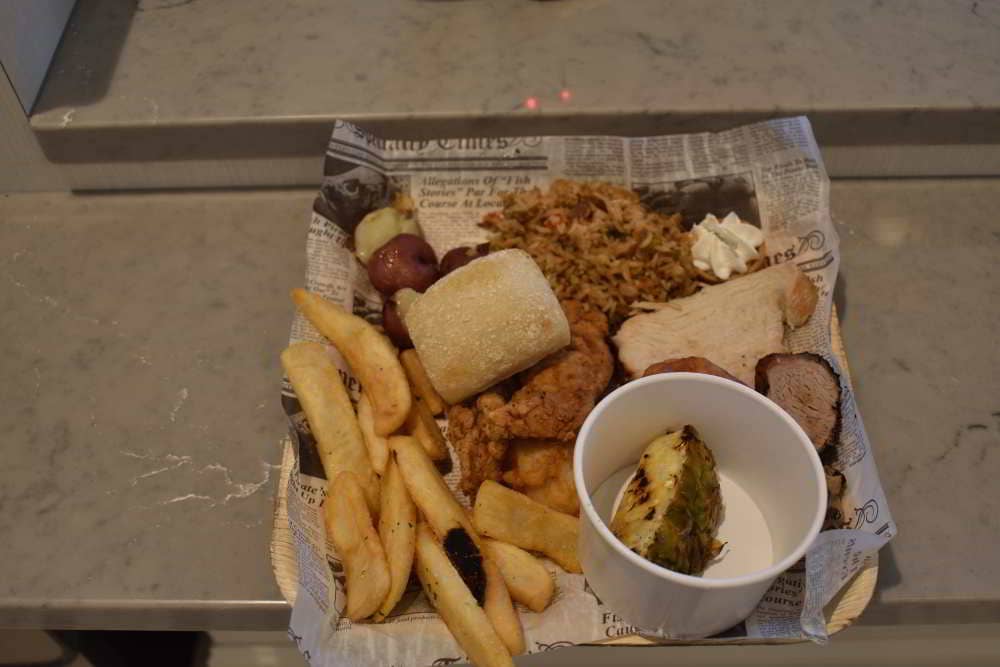 The food was excellent, with such selections as herb-rubbed pork loin, roasted turkey, funnel-cake-breaded shrimp, breaded cod, and chicken strips. Red-skinned potatoes, tropical fried rice, steak fries, grilled pineapple, and key lime pie are some of the other selections available, served through a serving line by very-friendly servers. The salads I tried (ramen noodle, shaved Brussels slaw, and marinated cucumbers and onions were good enough for me to make it a complete meal!