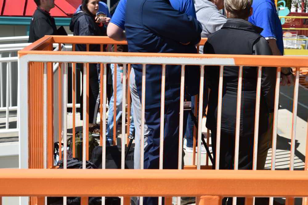 Two things we noticed. First, we were surprised that the painting of the ride’s loading station was obviously not finished, and what was painted looked a bit sloppy. It was still tacky to the touch, as the gentleman in front of us in line noticed when he pushed his thumb against it and left his fingerprint in the paint! To give Cedar Point a pass, we had five days of nearly unending rain before the Media Event, which might have delayed their last-minute plans to complete the paint job.