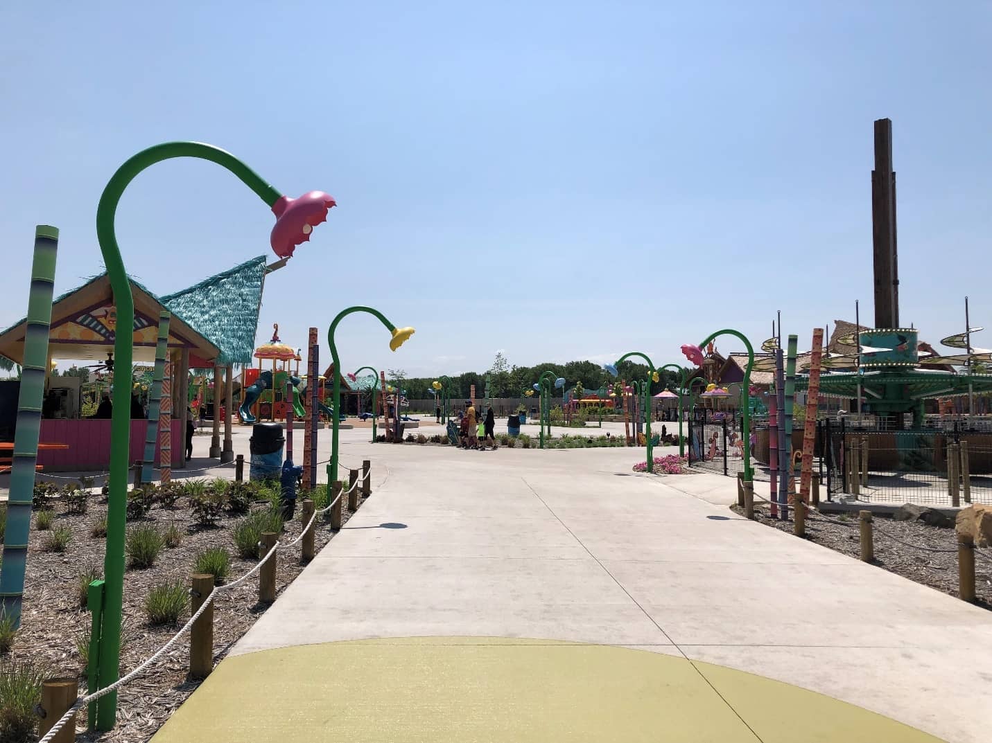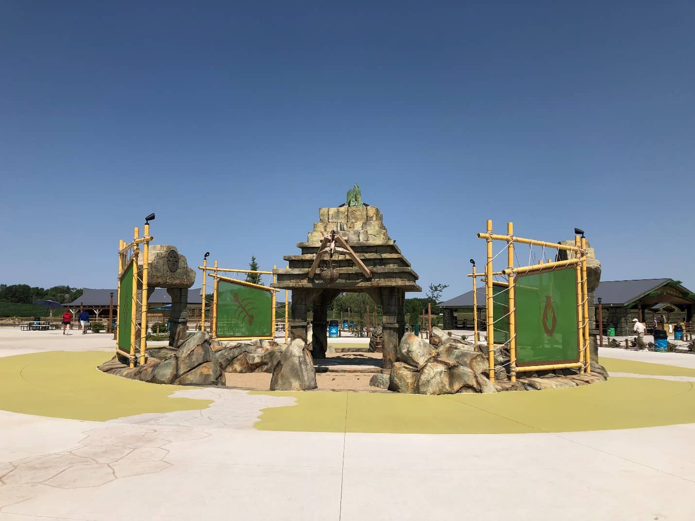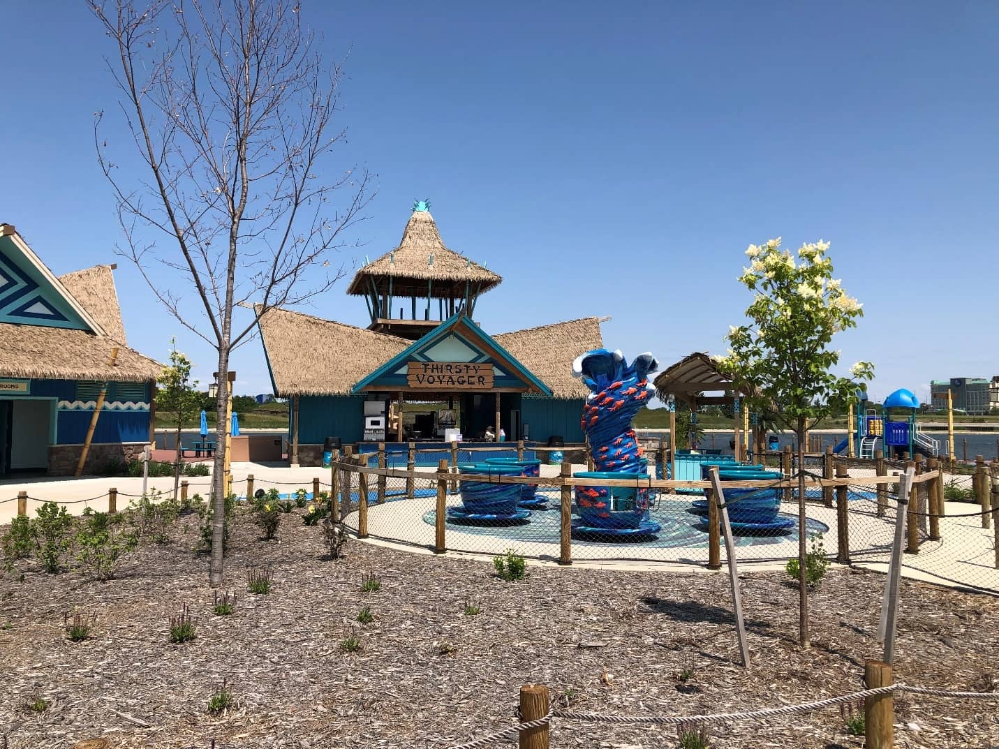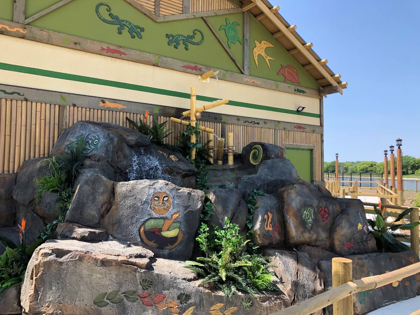 Crossing a bridge, we arrive at the second part of Awa, an island in the middle of Lost Island’s central lagoon. While most of the park is complete, this was sadly the one area that still felt like it needed some work. We saw crews still installing lanterns along the pathway in parts of this island, and the Nika’s Gift Carousel that has been delayed due to manufacturing issues is still far from completion. However, that doesn’t mean there isn’t anything to do here. The Alzanu’s Eye Ferris Wheel is at the dead center of the park and provides a great view of the entire property, and there are also a couple smaller flat rides as well as an arcade and multiple play areas to keep visitors entertained. This section of the park also houses the Thirsty Voyager, the only location in the park to purchase alcoholic beverages and join the islanders in their relaxation.