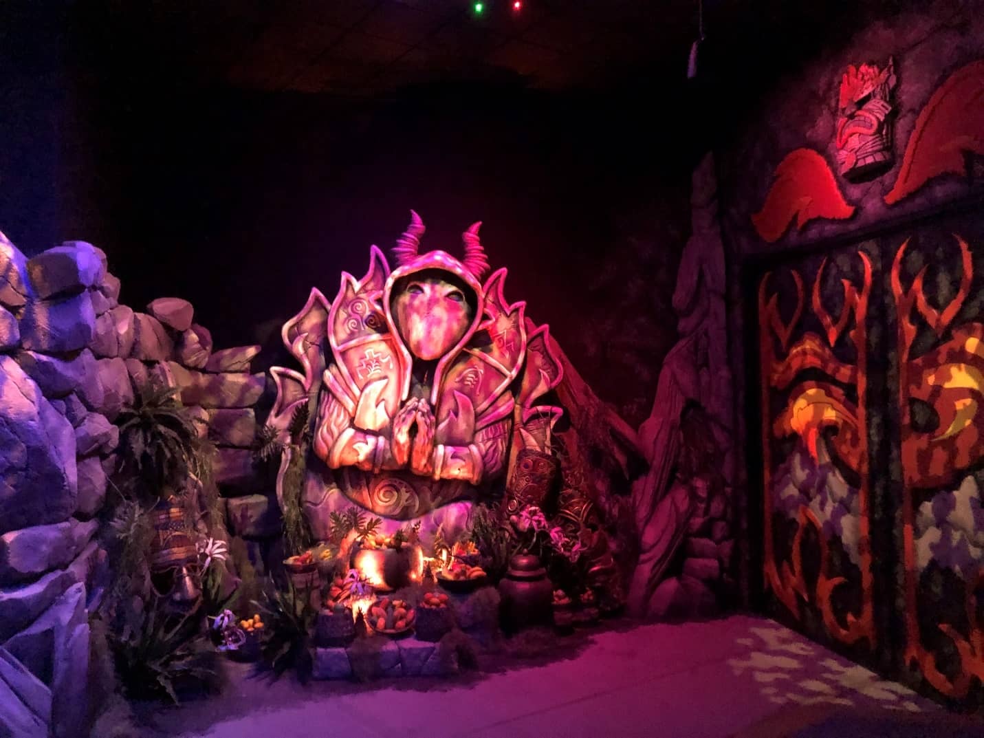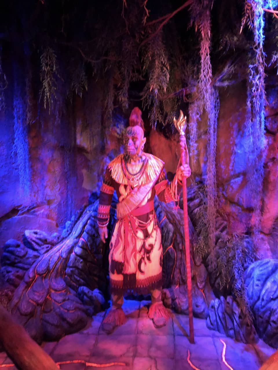Your adventure on this attraction begins with a pre-show setting the stage, followed by a winding indoor queue that contains other visual effects as well as an animatronic of the Shaman, your guide for this adventure.