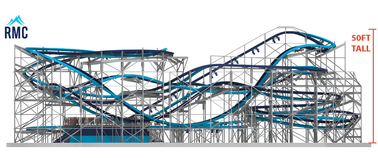 The as-yet-unnamed shuttle coaster features a 590-foot, U-shaped track with a peak of 144 feet and a top speed of 60 mph. The surfboard-shaped trains hold two spinning circular platforms, each with 10 outward-facing seats.