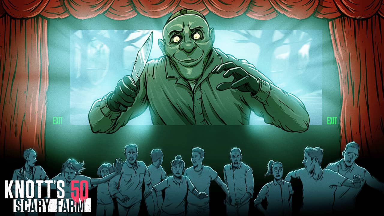 "Venturing through the mystical Midnight Theater, guests travel through the silver screen and into a trilogy of slasher movies. As they are swallowed into the world of gothic horror, they become the movie characters who try to escape the wrath of the dangerous Slasher," Knott's described the maze in its press release.