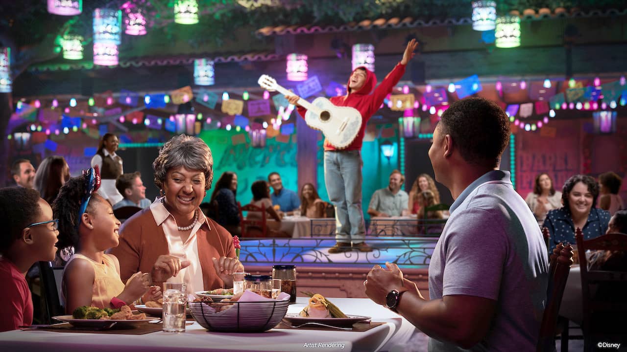 "Frozen"'s Arendelle is out, and "Coco" is in, as Plaza de Coco joins the rotational dining line-up on the Treasure. The theater-in-the-round layout will remain from the Frozen show, with two different musical productions staged in the rethemed Mariachi Plaza during the seven-night cruise. One will feature Miguel with his parents and grandmother, while the second will celebrate Día de los Muertos as Miguel and his magic guitar bring his great-great grandparents, Hector and Mama Imelda, back to Santa Cecilia.