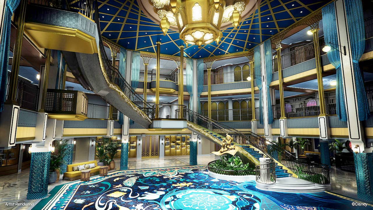 The Treasure's Grand Hall will be themed to "Aladdin," with Aladdin and Jasmine on the Flying Carpet as the hall's character statue. The hall also will feature a bolder and darker color palette than the bejeweled "millennial gray" look of the Grand Hall on the Disney Wish.