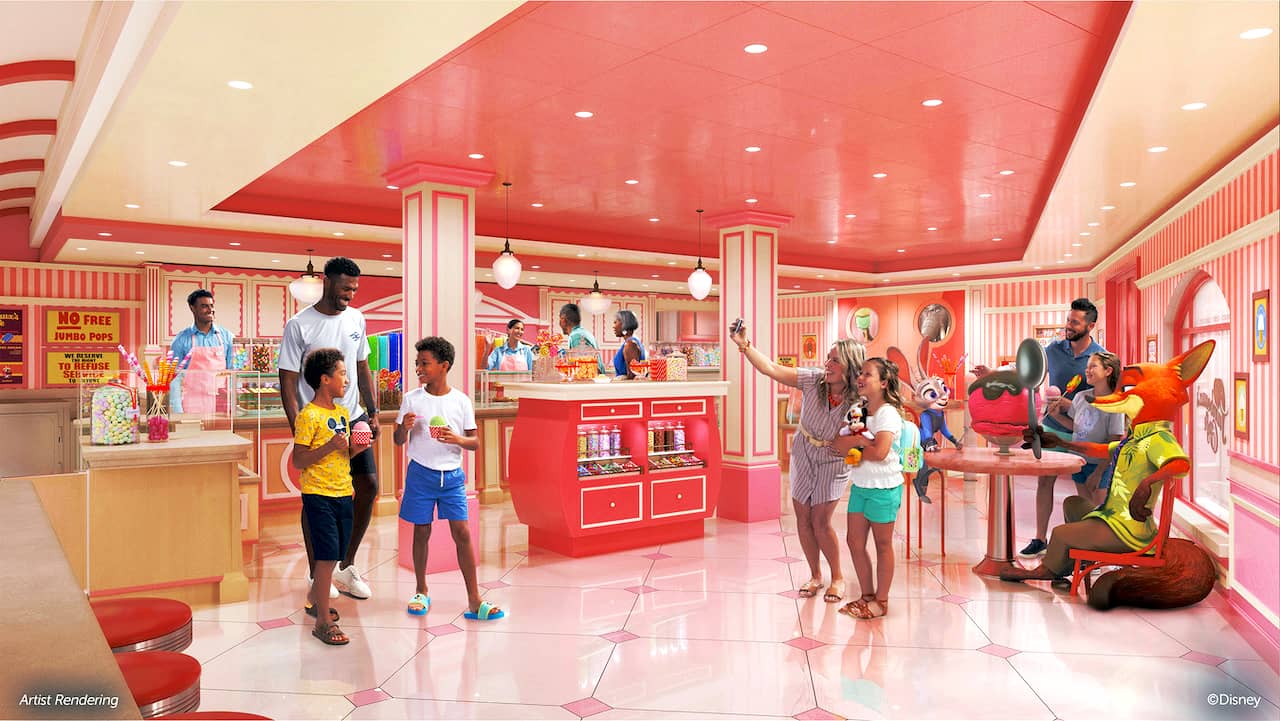 The Inside Out: Joyful Sweets shop on the Wish becomes the "Zootopia"-themed Jumbeaux's Sweets on the Treasure, serving 20 flavors of gelato, 16 flavors of ice cream and sorbets, specialty treats, and candies.
