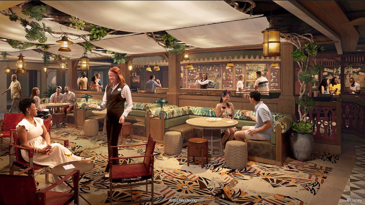 Moving on to the lounges, the Wish's "The Princess and the Frog"-themed The Bayou lounge transforms into the Jungle Cruise-themed Skipper Society on the Treasure. Camp-style furnishings and jungle decorations will provide the setting for themed cocktails and snacks, as well as live entertainment and "punny" jokes from the staff.