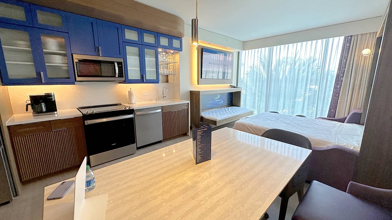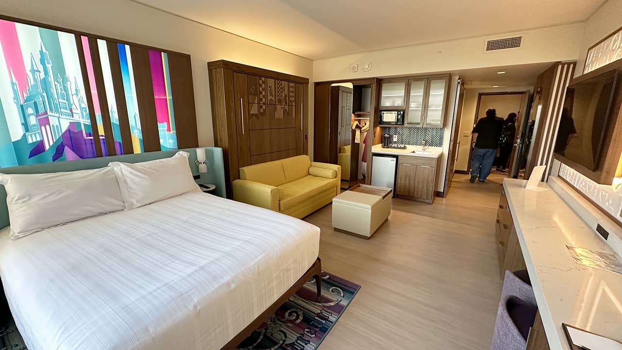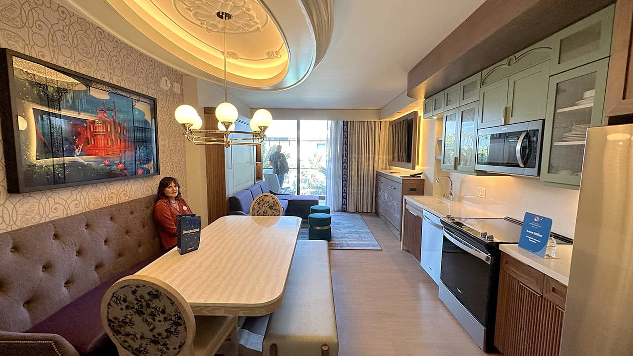 In addition to the studios, the Discovery Tower offers three types of Villas: one-, two-, and three-bedroom. We toured a "The Princess and the Frog"-themed one-bedroom Villa, which sleeps up to five people and includes a fully equipped kitchen and stacked washer and dryer.