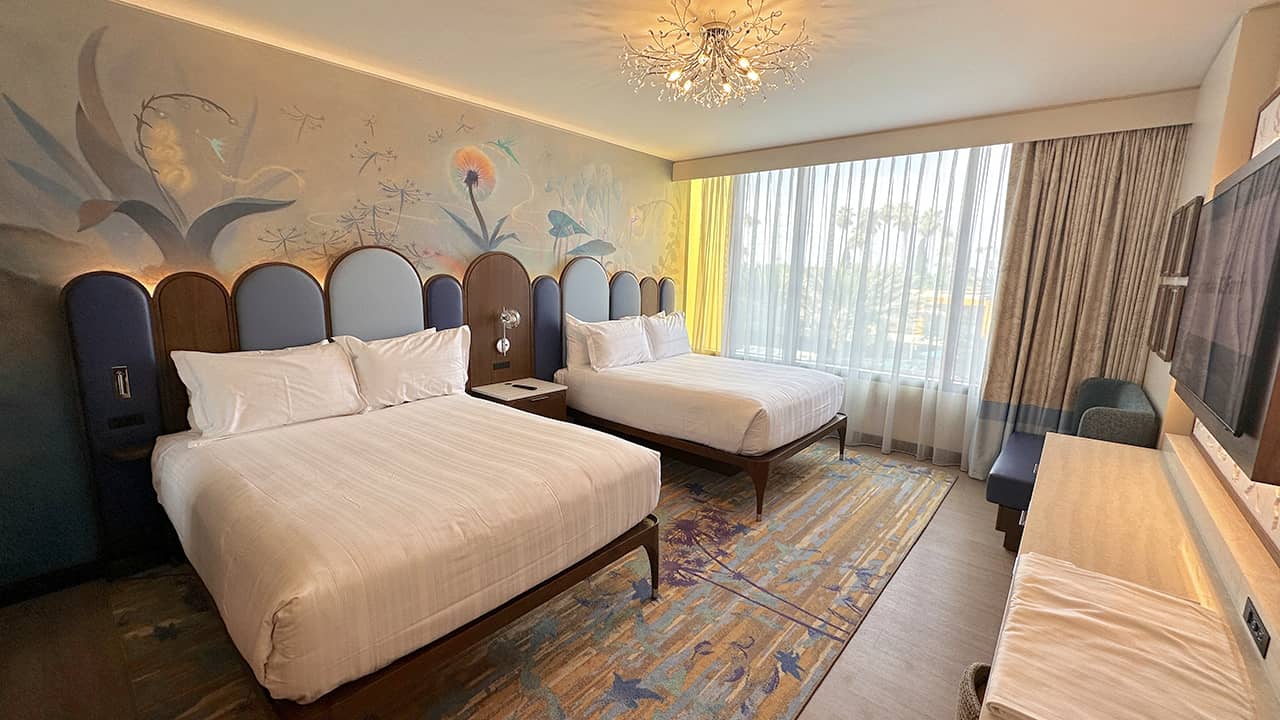 In general, I found all of these rooms nicely appointed, with abundant device charging available, well-lit bathrooms with plenty of sinks, and in-room dining available for order, too. With pools on either side of the building, almost all rooms have a pool view, though rooms facing west on the upper floors will have views of the adjacent neighborhoods rather than the Disneyland Resort.