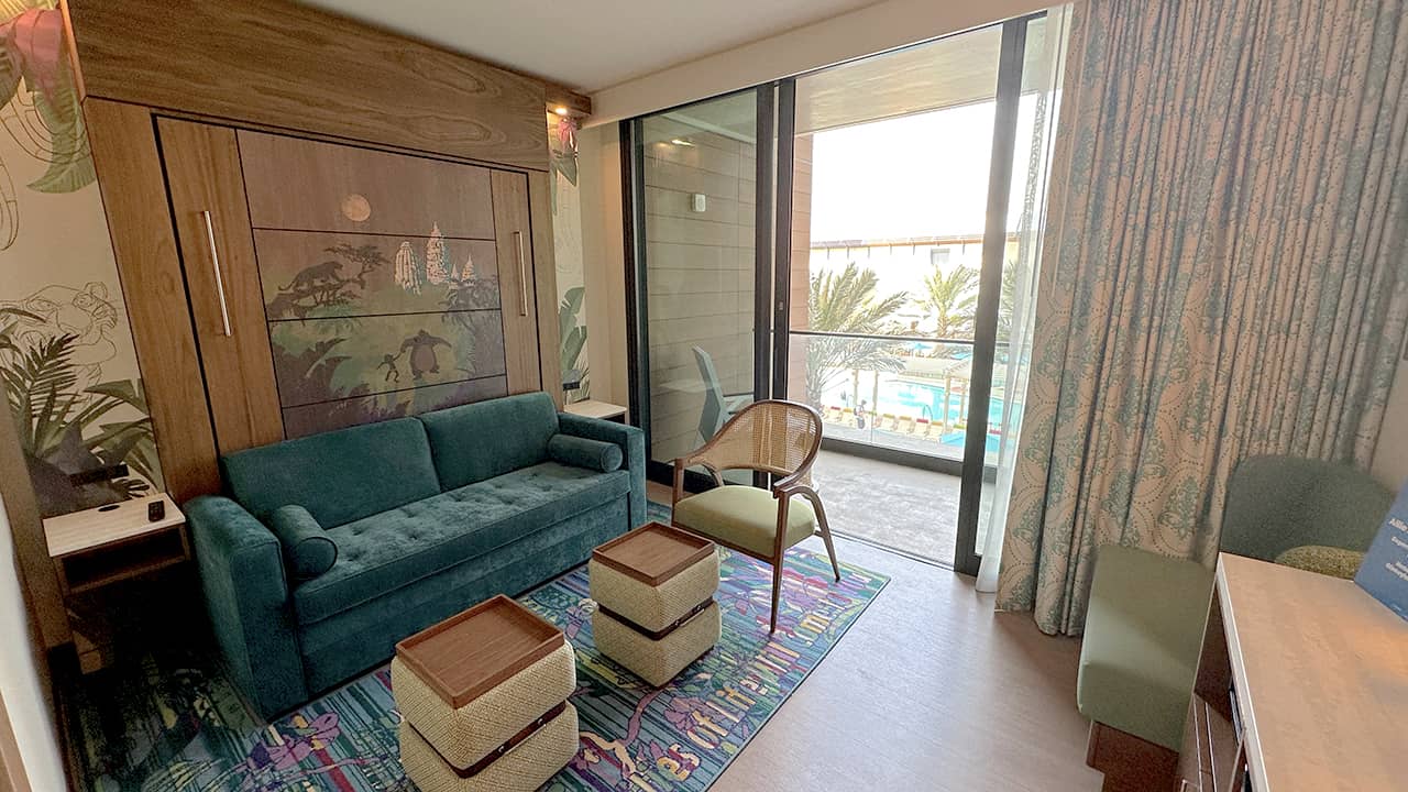 Let's start in the smallest of the Discovery Tower rooms - the Duo Studio. Themed to the Jungle Cruise, this room offers a pull-down bed - and not much else.