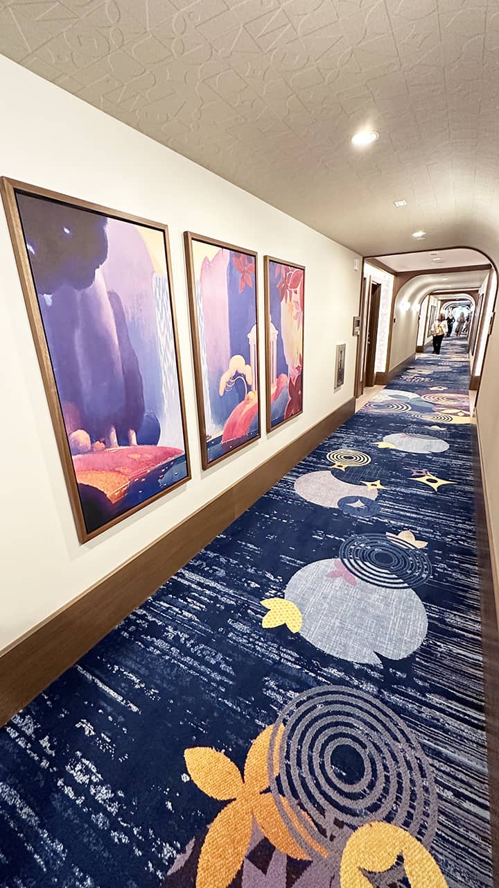 Colorful carpets and murals featuring Disney Animation franchises decorate the hallways through the tower.