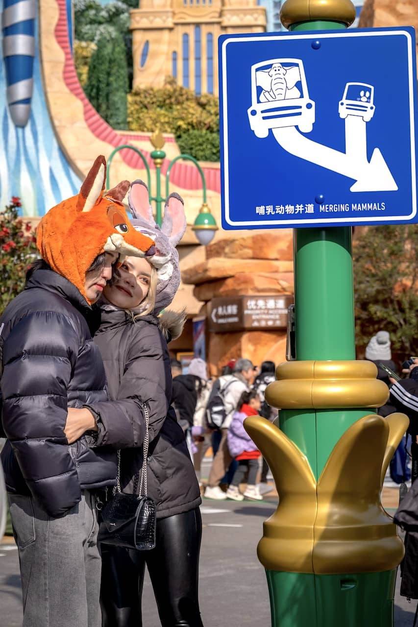 For example, a small upside-down club down Nocturnal Alley has a sign dubbing it "the Hangout" - it is, after all, a nightclub for bats. A silly pun that just doesn't translate into Mandarin, and so the sign is only in English. Elsewhere, an all-Chinese bench advertisement of smiling lions brandish their brand new sneakers, encouraging you to buy "狮凯奇" - a riff on the Chinese word for "Skechers," made by replacing the first character with the one for lion. It's a similarly eyeroll-inducing joke but makes zero sense in English. They've managed to pack in enough jokes that guests will leave the land with the same flavor of cringey wordplay, regardless of linguistic background.