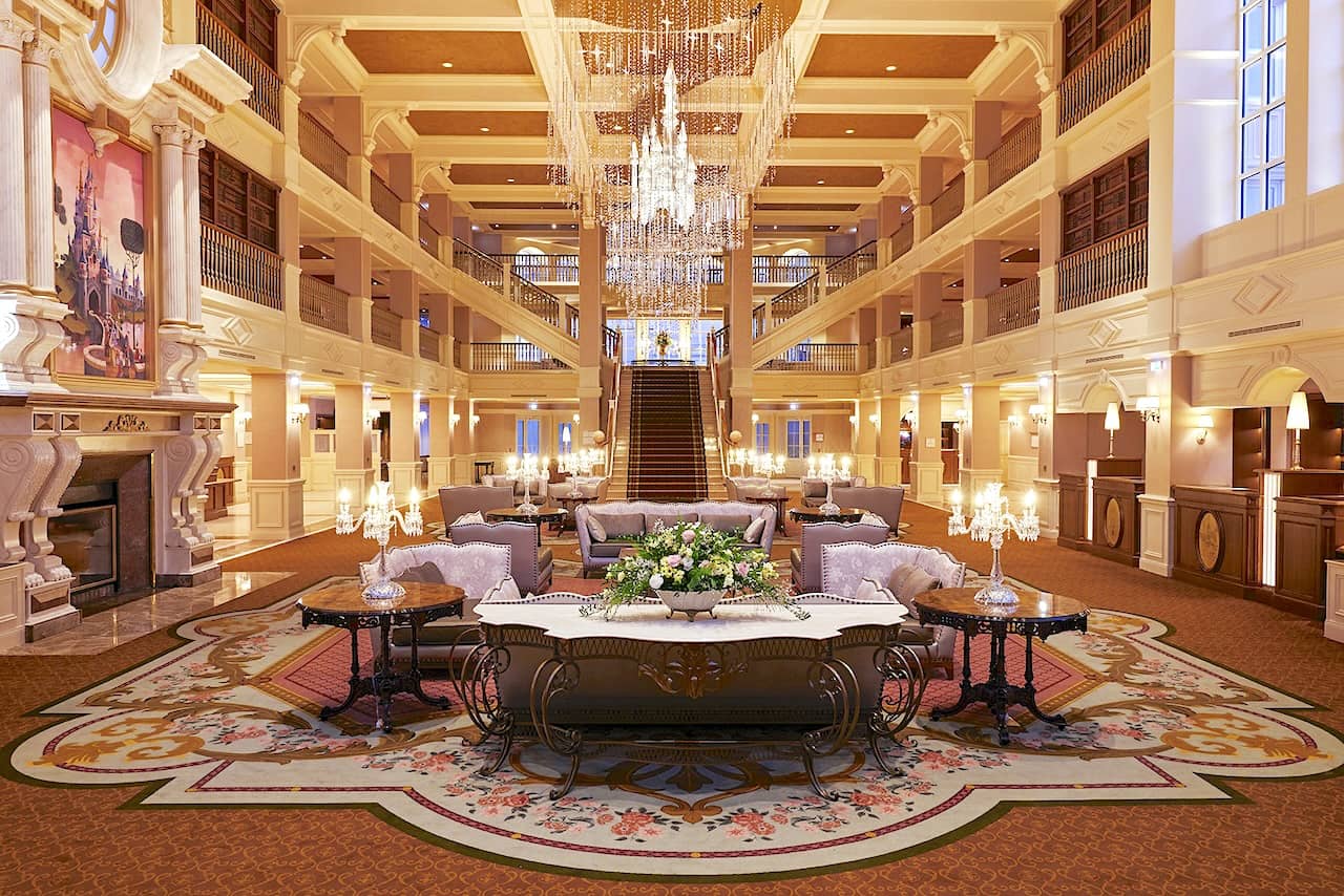 The new lobby of the hotel featured ivory and gold tones, inspired by "the libraries of world-famous French castles," according to Disney's Imagineers. Its centerpiece is a new Bohemian crystal chandelier, representing the park's Sleeping Beauty Castle.