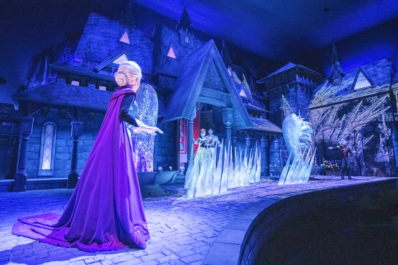 The rock trolls again open the story, framing the ride as a retelling of what in Arendelle is the famous story of how Elsa revealed her powers and Anna sacrificed to save her sister, protecting the kingdom.