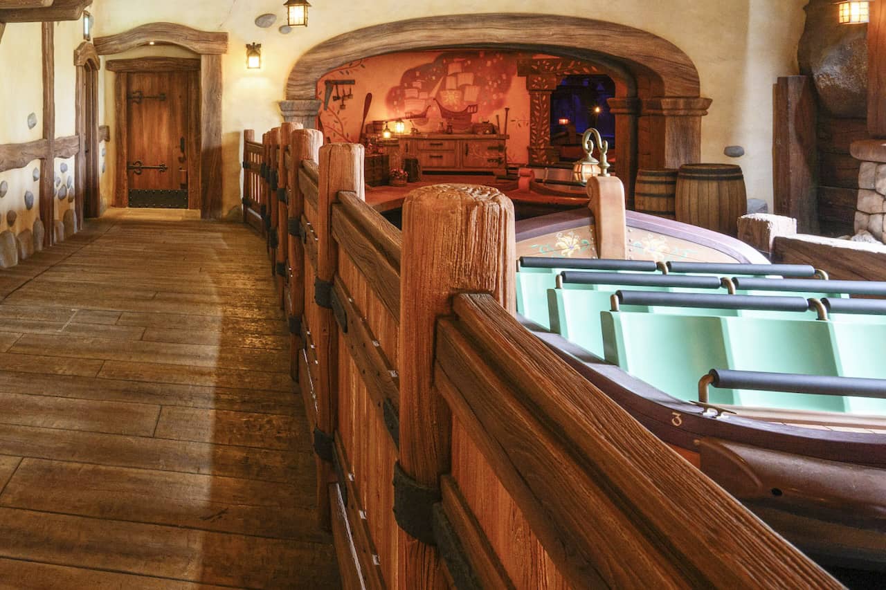 Once aboard, the ride focuses on the Rapunzel and Flynn Rider, introducing both characters in its outdoor portion. As appropriate for this early moment in their story, Rapunzel remains far above, in her tower. But this Animatronic representation allows Rapunzel to remain an engaging character even at distance.