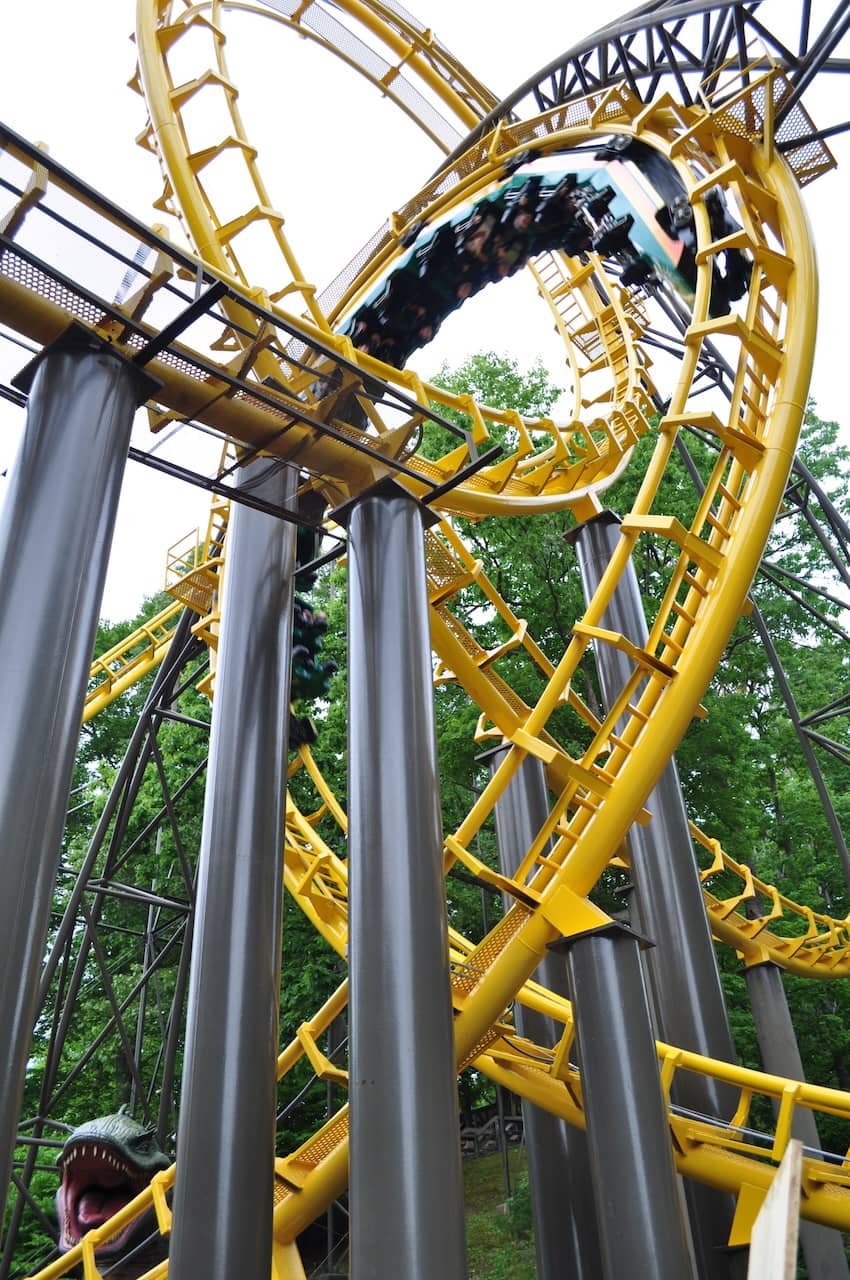 While the coaster layout remains unchanged, the park replaced over 900 feet of track to smooth out some of the rough spots, particularly entering and exiting the interlocking loops that were previously borderline head-jarring. However, there's still a dramatic trim brake on the hill leading down into the first loop, and both lifts still operate at a snail's pace, though a soundtrack plays on speakers mounted along the lengths of the hills to keep guests engaged while the train slowly climbs each lift.