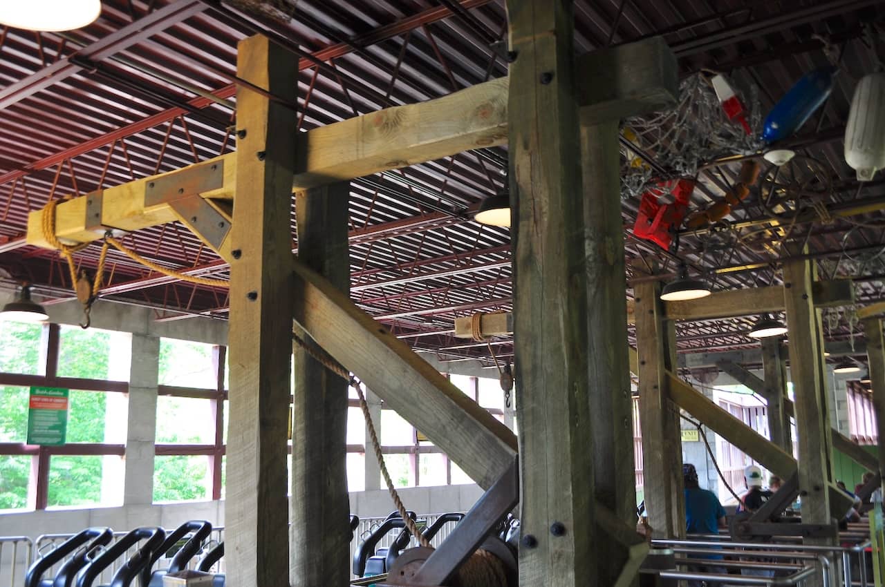 As guests enter the station, the dedication to the theme is on full display with lots of nautical props in the ceiling, giant pulleys extending over the track, and an instrumental soundtrack preparing guests for what will be a fully themed voyage in search of Nessie.
