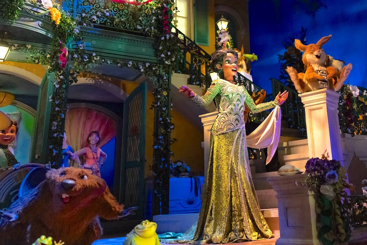Here, at last, lies the "Blue Bayou" that Walt Disney World's Magic Kingdom never had before now. Even more lovingly decorated that Disneyland's 1967 original inside Pirates of the Caribbean, Tiana's bayou comes alive with Audio Animatronic critters playing "Gonna Take You There" and animated fireflies on background screens, all hyped by our gator Louis, who appears via multiple animatronics during the ride.