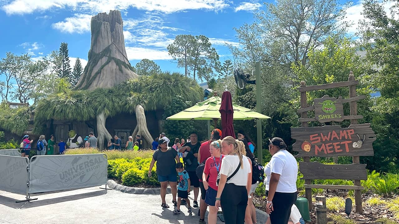 If you get past Gabby, the first zone in DreamWorks Land is Shrek. Start at his cottage, where you can meet the big green ogre, Princess Fiona, and Donkey.