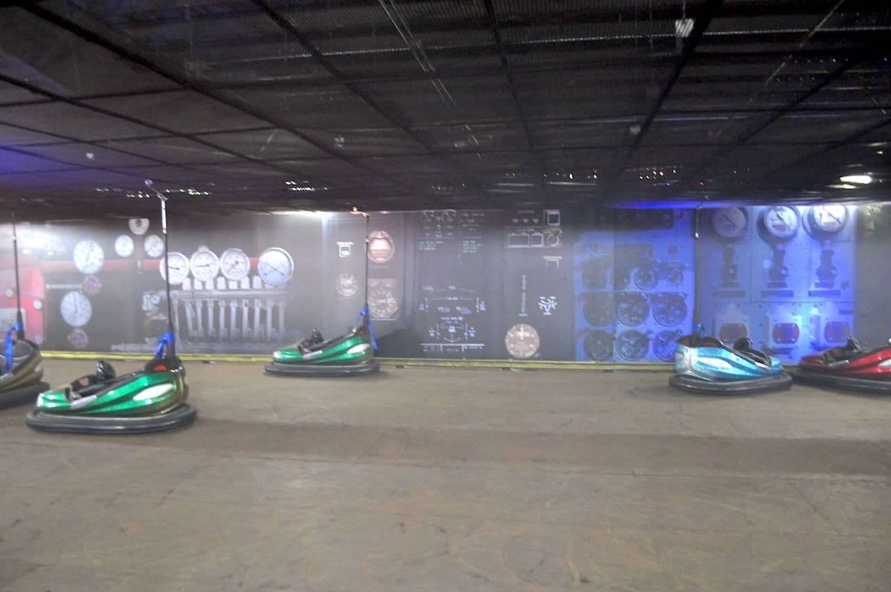 The rest of Steam Town takes the existing Coyote Creek attractions and gives them a steampunk twist. ElectroDerby is a retheme of the park’s bumper cars. It looks like the park might eventually include theatrical fog and lighting on the renovated attraction, but the only difference I noticed on my ride was the removal of the center curb and a large mural on the back wall suggesting the cars are being powered by a Tesla-inspired creation.
