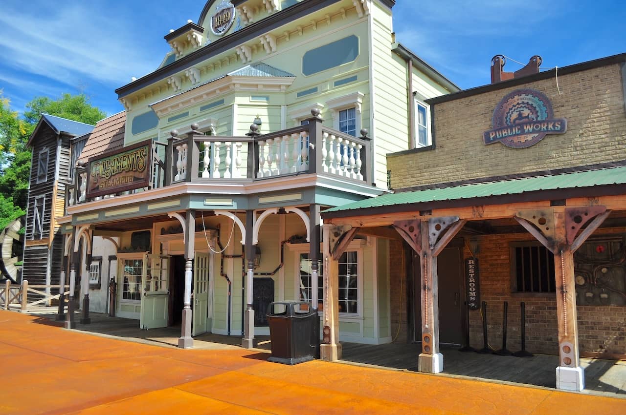 Six Flags America is one of those theme parks that has to be more selective with their investments, and despite their newest project representing the largest park investment in two decades, using an internally developed IP has made Steam Town a successful addition. The renovated park space, themed after a Victorian-era steampunk universe with a bit of time traveling thrown in, takes over the former Coyote Creek (Old West) area of the park. The concept behind Steam Town is that Coyote Creek was secretly purchased by Professor Screamore, who is anxious to share his inventions and thrilling creations with the world.