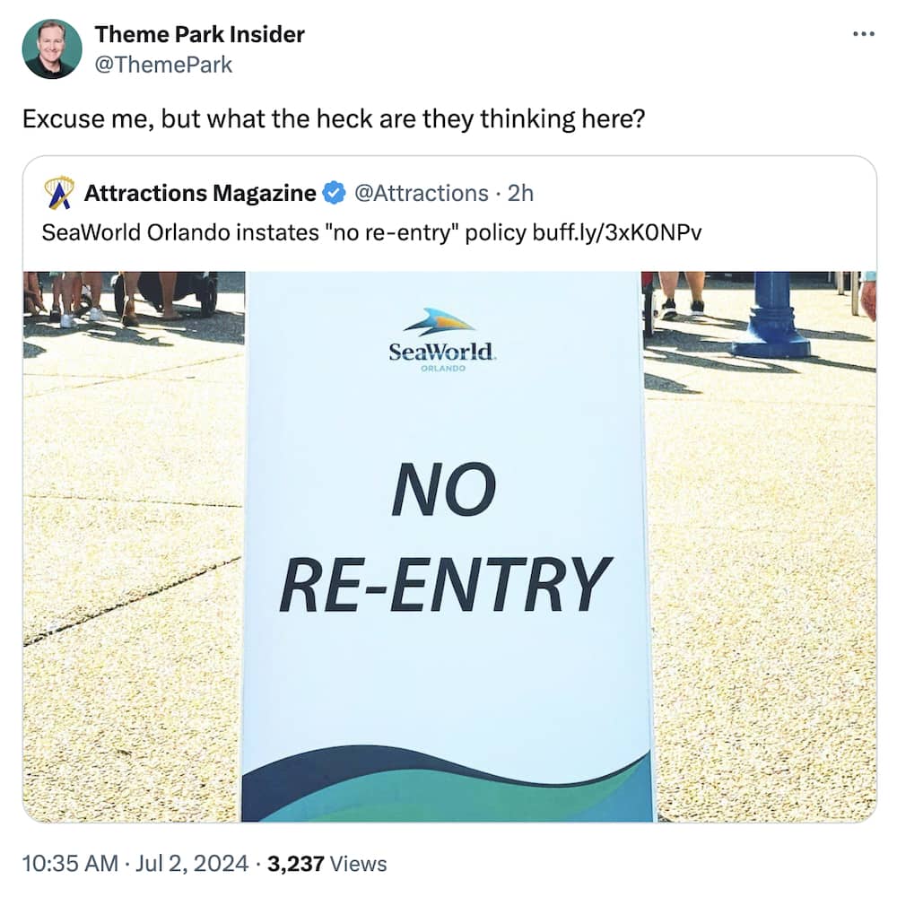 Personally, I consider it an inconvenience but not a deal breaker, especially at a park like SeaWorld Orlando. My guess is most guests to that park aren't leaving and returning the way they do at the resort properties, and particularly with some of the issues that the parks have faced lately it does serve as a bit of a deterrent to potential troublemakers. As this is the busiest week of the summer and the park will likely hit capacity crowds, I don't fault them for what is likely a temporary policy change (similar to the way Fun Spot put a temporary chaperone policy in place due to expected extreme crowds).