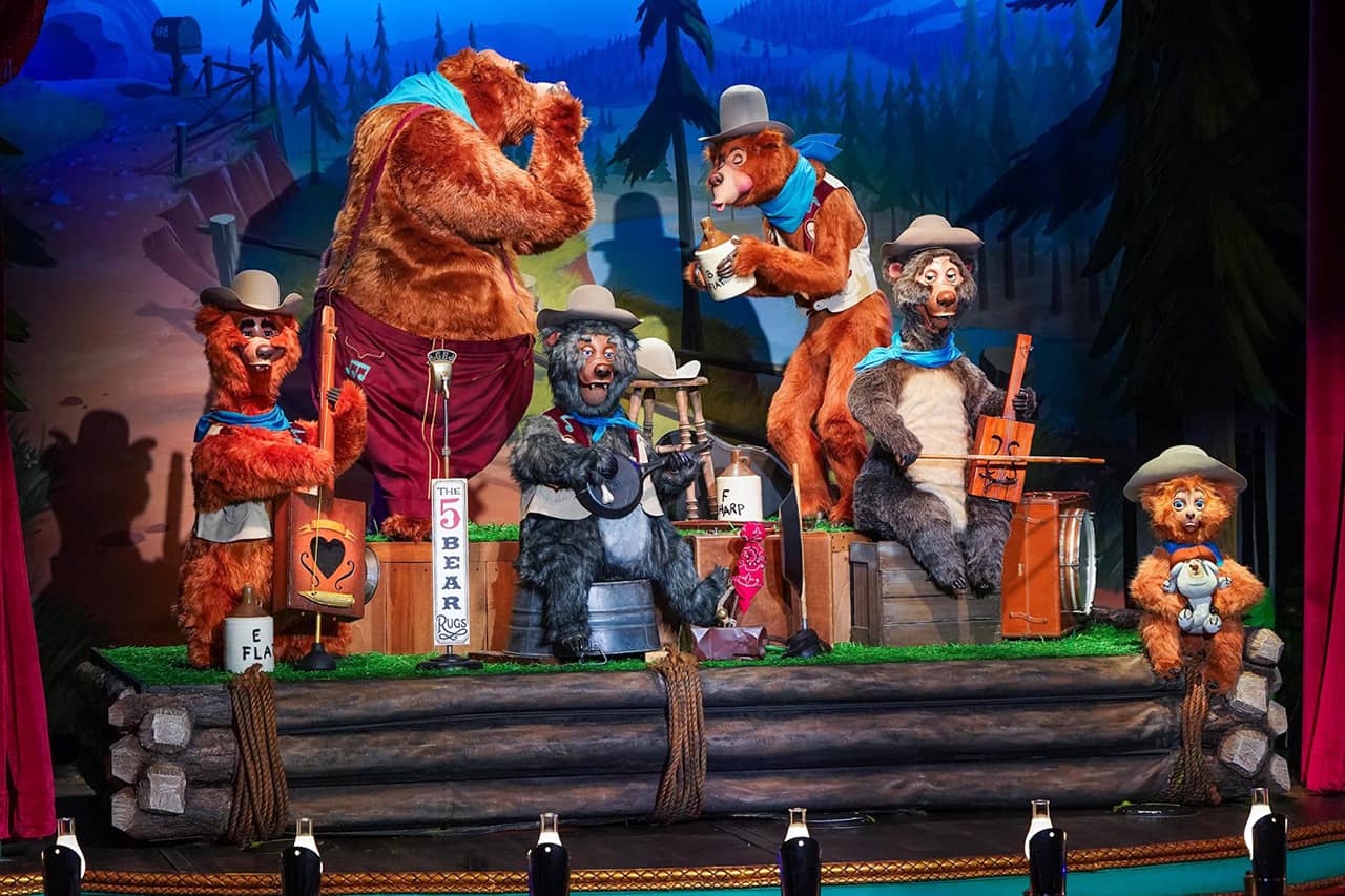 The house band for the Country Bears is Five Bear Rugs, comprised of Zeb, Zeke, Fred, Ted, and Tennessee, who are joined onstage by Zeb's son Oscar, who is holding a plush Big Al this time.