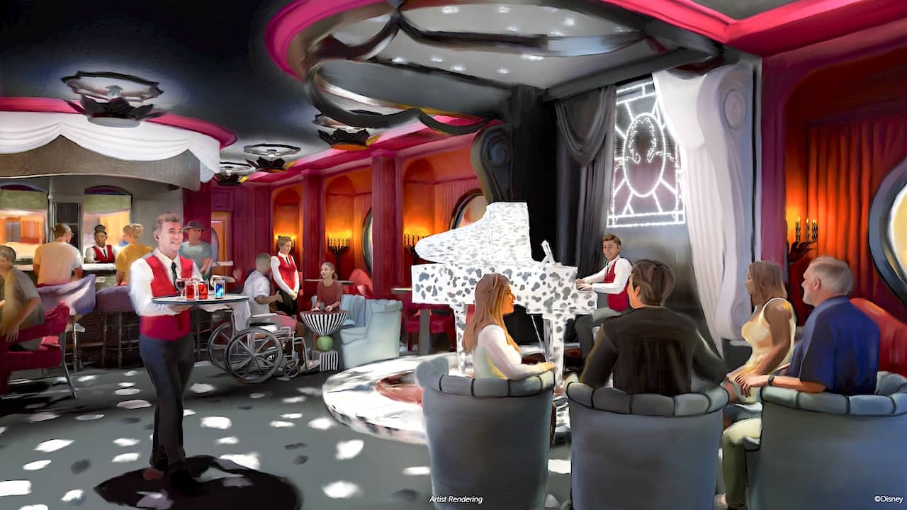 One side of the 101 Dalmatians lounge, De Vil's piano bar, will be open to Destiny's Grand Hall. This will be an adults-only space, designed with a Hollywood Regency-inspired aesthetic and Cruella de Vil's iconic color palette of red, white, and black.