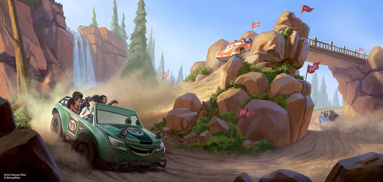 A "reimagined area of Frontierland" in the Magic Kingdom will feature two new Cars-themed attractions, "a thrilling off-road rally race and a family friendly attraction even the youngest racers will love."