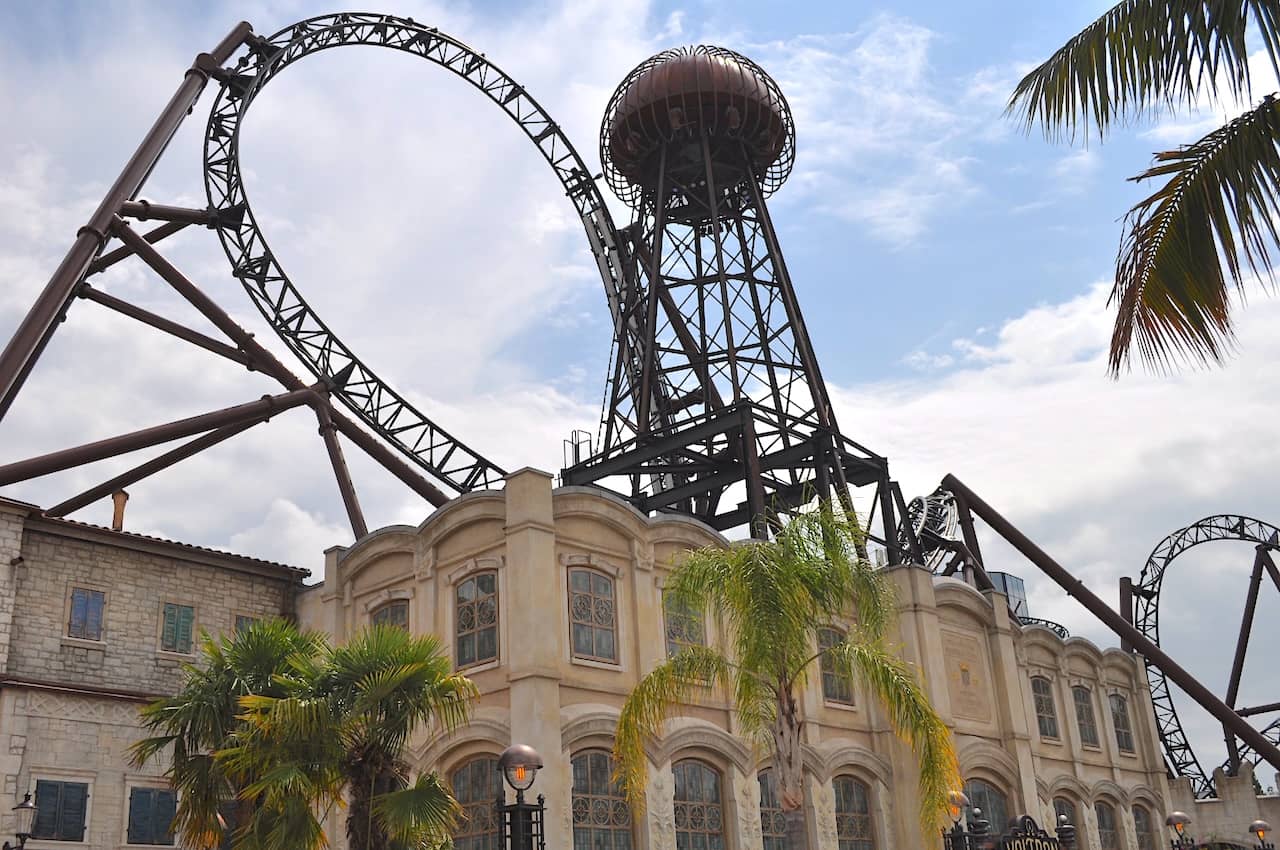 The coaster has excellent theming, especially when you consider the thrills that it packs. It’s rare to come across a coaster that can combine both great theming and high-octane thrills with VelociCoaster and Project 305 (when it still had heavy NASCAR theming) being the rare exceptions. Voltron’s façade is gorgeous with a museum-style building topped with a massive Tesla tower and the world’s first beyond-vertical launch track extending above the roofline and into the first inversion.