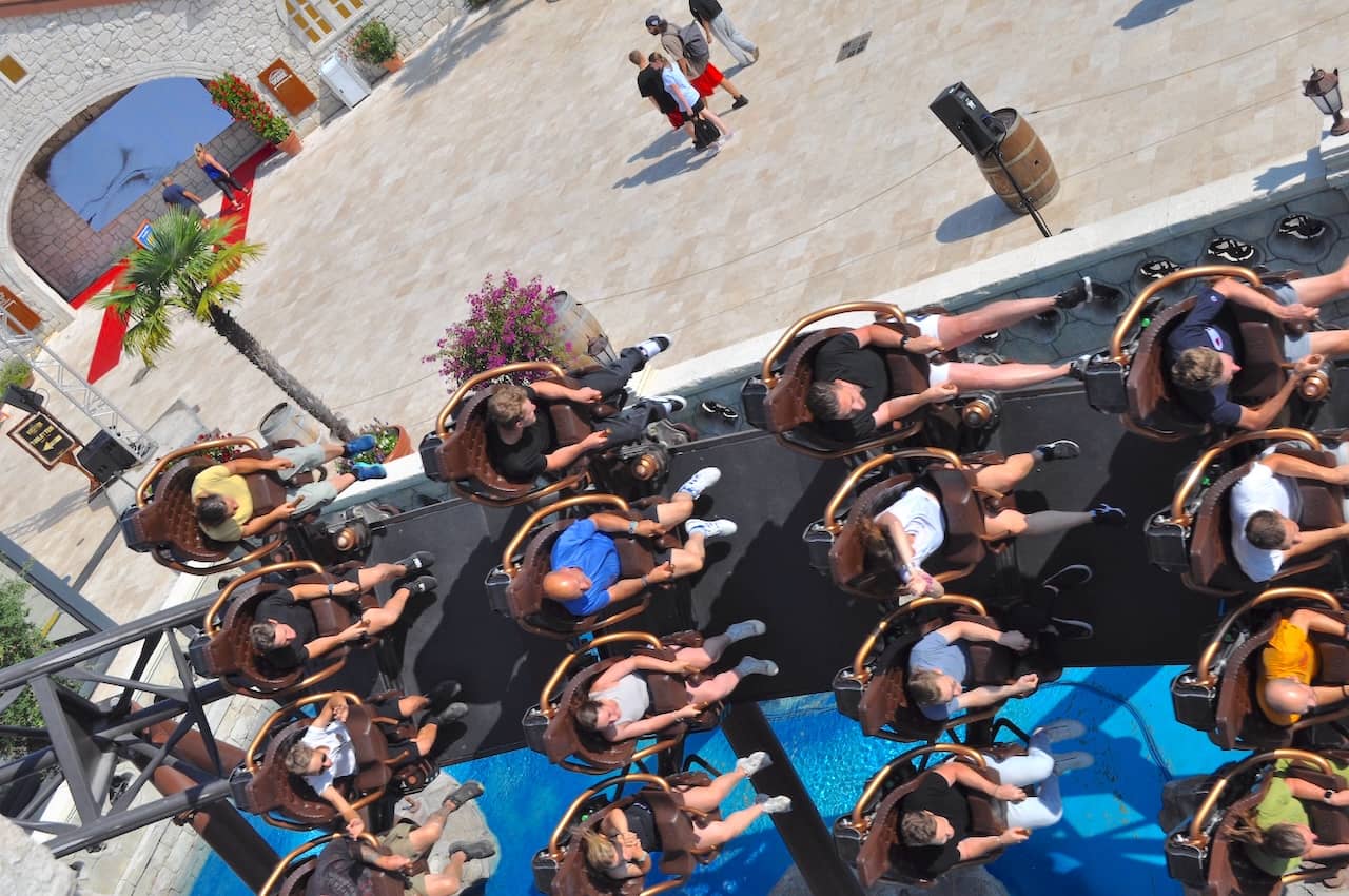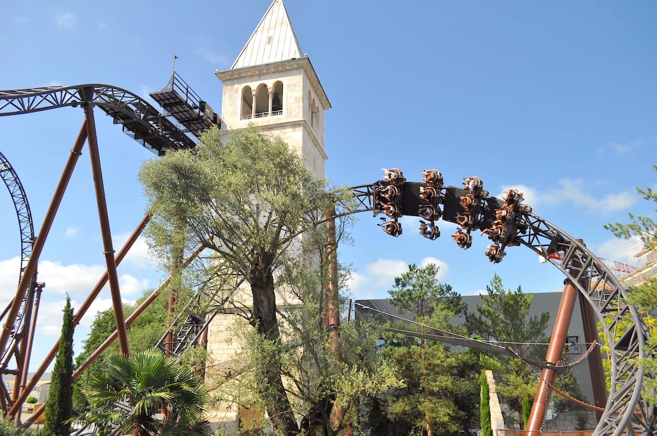 I assume Voltron probably has your attention by now, because designers are ready to wow you with an outward banked turn, and another low-slung airtime hill before taking you into the final section of the course. That finale is what really clinched Voltron’s top spot on my current coaster rankings as the train dives into a slow roll near Croatia’s main square.