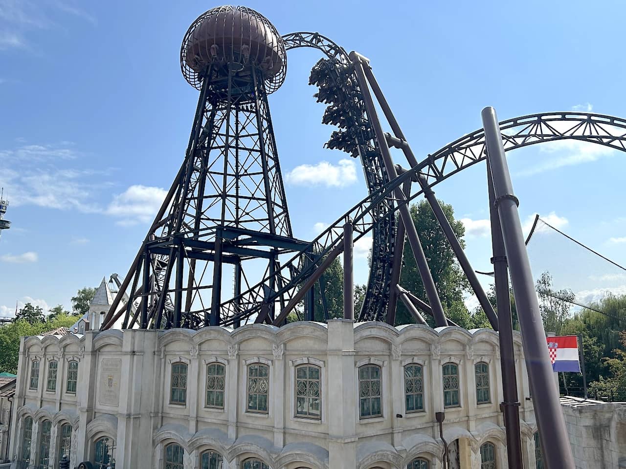 Our European road trip was taking us to five theme parks that we had never visited before, but of all those parks, just one of them had opened a major new attraction in 2024. Europa Park debuted Voltron Nevera Powered by Rimac at the end of April, and since its debut, this quickly became one of the most anticipated attractions of our entire trip. This Mack “Stryker” coaster is the centerpiece of a new Croatian-themed land and celebrates the innovations of Nikola Tesla – I guess Elon Musk didn’t want to sponsor the ride, so the park instead turned to the Croatian hypercar manufacturer Rimac, who have a car on display near the ride’s extended queue and sell branded merchandise in the coaster’s gift shop.