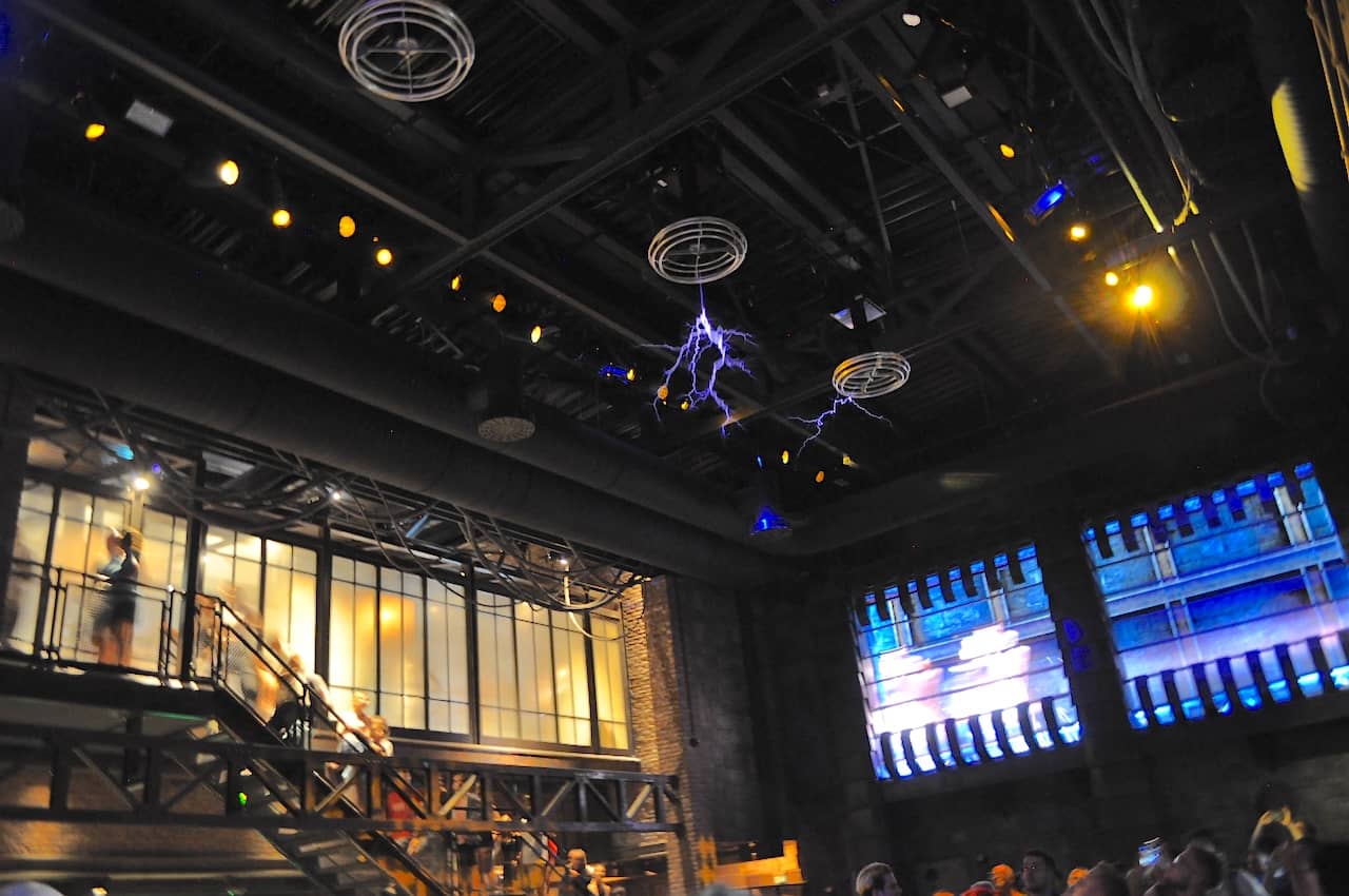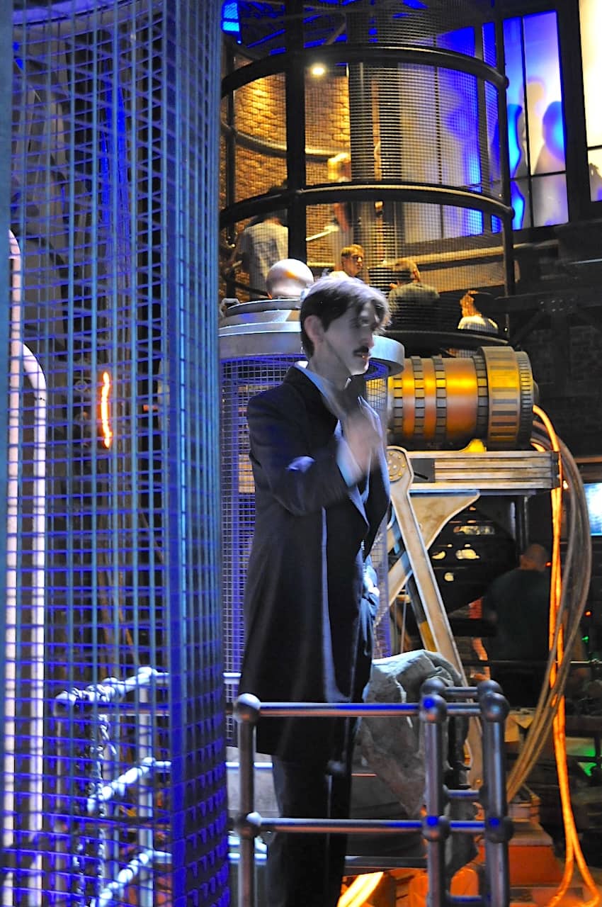 The main exterior queue behind the building contains a number of massive artifacts that look like giant transformers and huge electrical cables. The primary interior queue is where the theming is taken to another level and where you will find a Tesla animatronic figure conducting experiments and powering his machines.