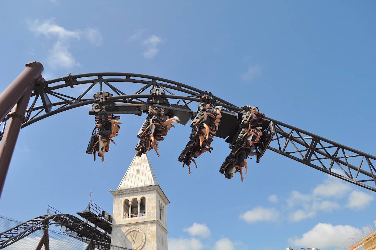 This creates loads of hang time before the track turns the train right-side up and into a short dive along the ride building’s roof to pick up speed for a mind-bending sequence featuring a corkscrew, low-slung airtime hill, and an Immelmann.