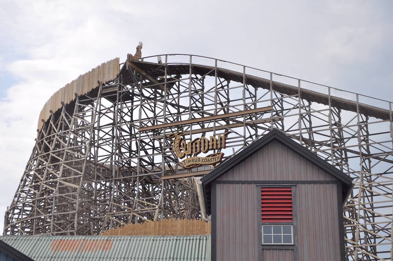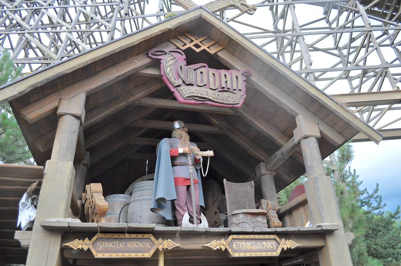Another coaster that bucks the trend of utilizing Mack rides is Wodan Timbur Coaster. This wooden roller coaster from GCI debuted back in 2012, and for my money is the best GCI I've ever ridden, topping Mystic Timbers. Wodan is located in the Iceland section of the park and has been given a robust Viking theme that starts with numerous wood-carvings in the entrance courtyard, an ornate sign, and animatronic figures in the ceiling of the station that watch over trains as they arrive and depart.