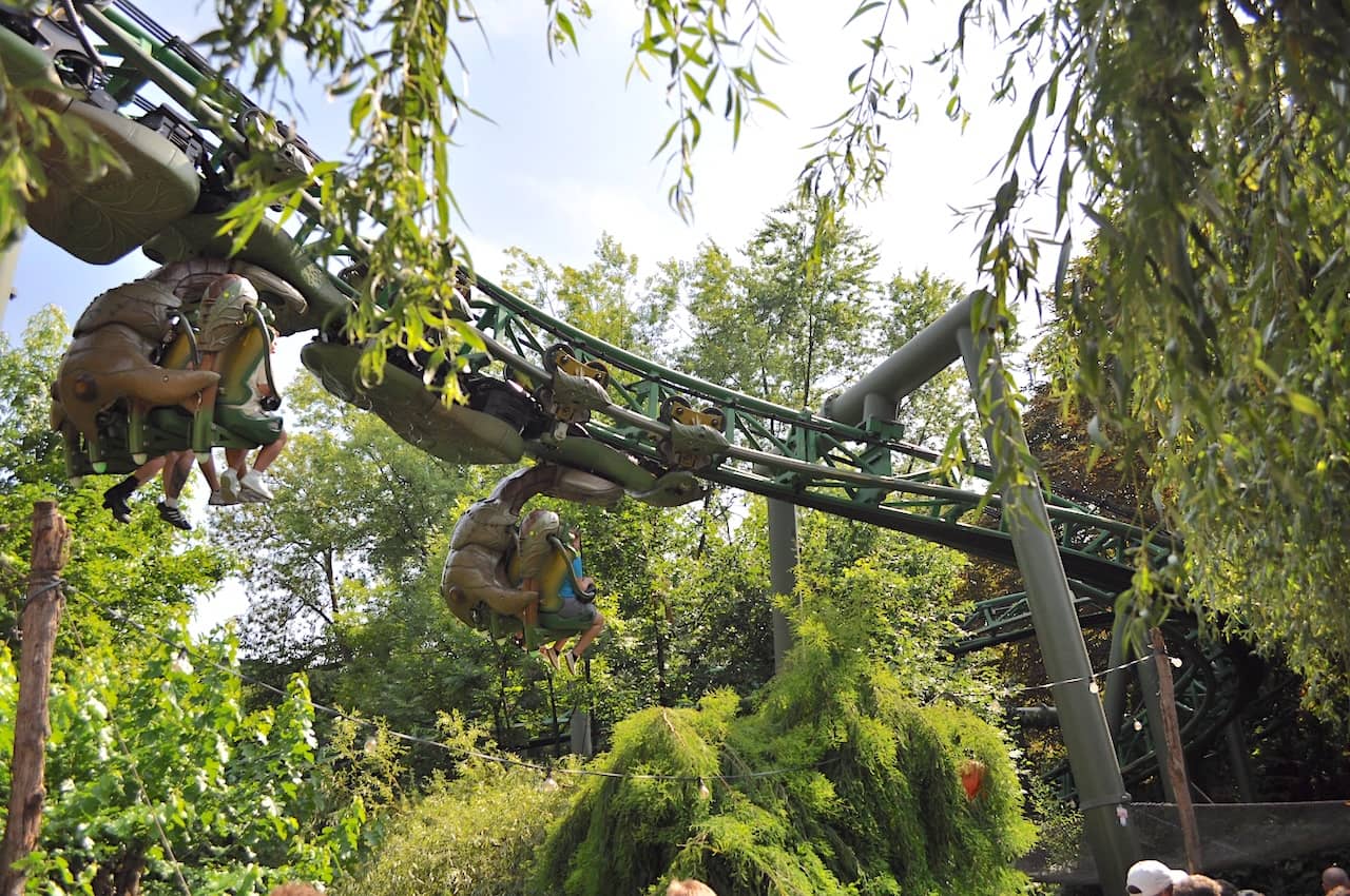 Once of the more unique coasters at Europa Park is Arthur, which is an inverted powered coaster themed around the movie Arthur and the Invisibles from writer/director Luc Besson (of Fifth Element and Taken fame). The trains have four seats in each row that can spin around to face guests in different directions as they go through the course, through dark ride scenes, and even outside.