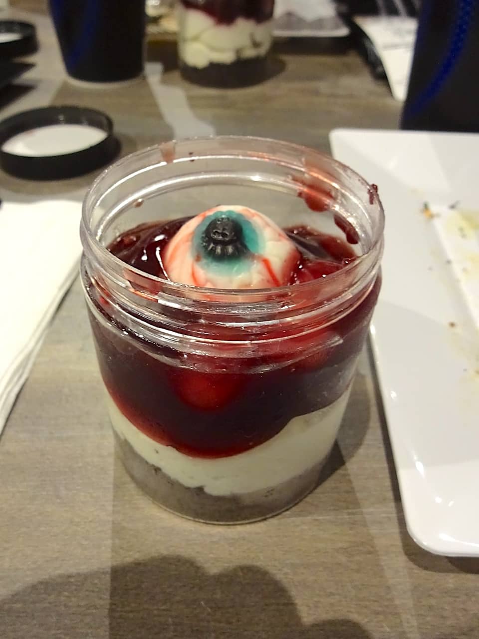 The best thematic foods we sampled were the desserts. There was a Cherry Cheesecake Jar topped with a gummy eyeball that was pretty good, though the cherry topping here seemed like it might have been from a can.