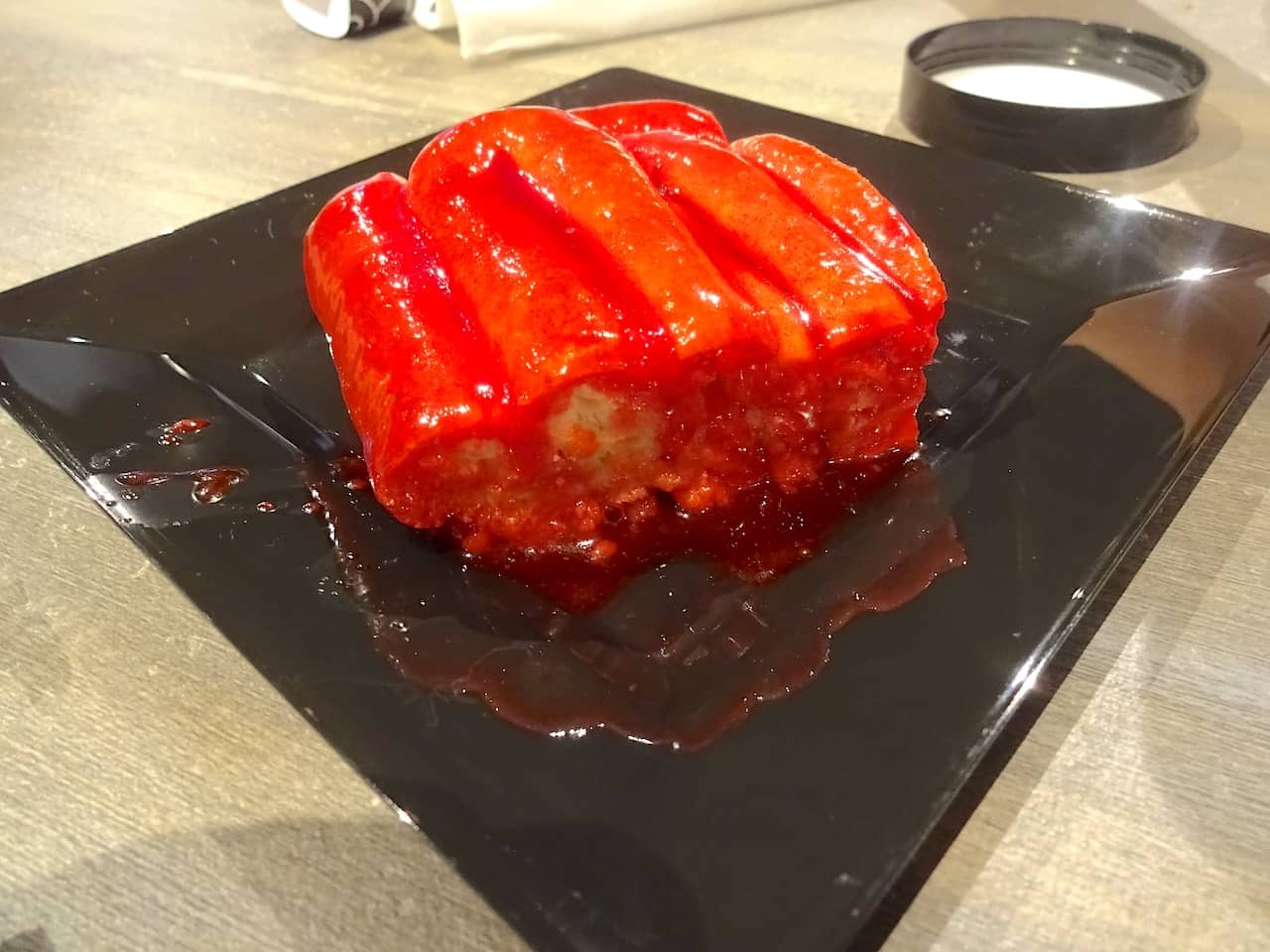 However, the cheesecake and chocolate cookie crumble beneath were good and helped to offset the very tart cherry filling. The other dessert we sampled was Cinnamon Bread Intestines, which were exceptionally gross looking with a gooey red syrup topping making the underlying bread look just like someone was disemboweled on your plate.