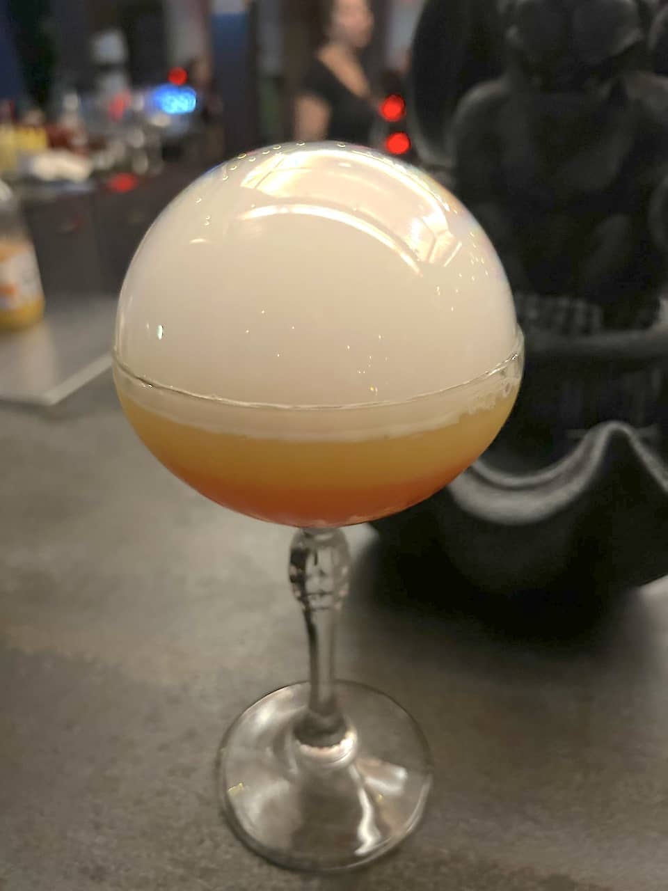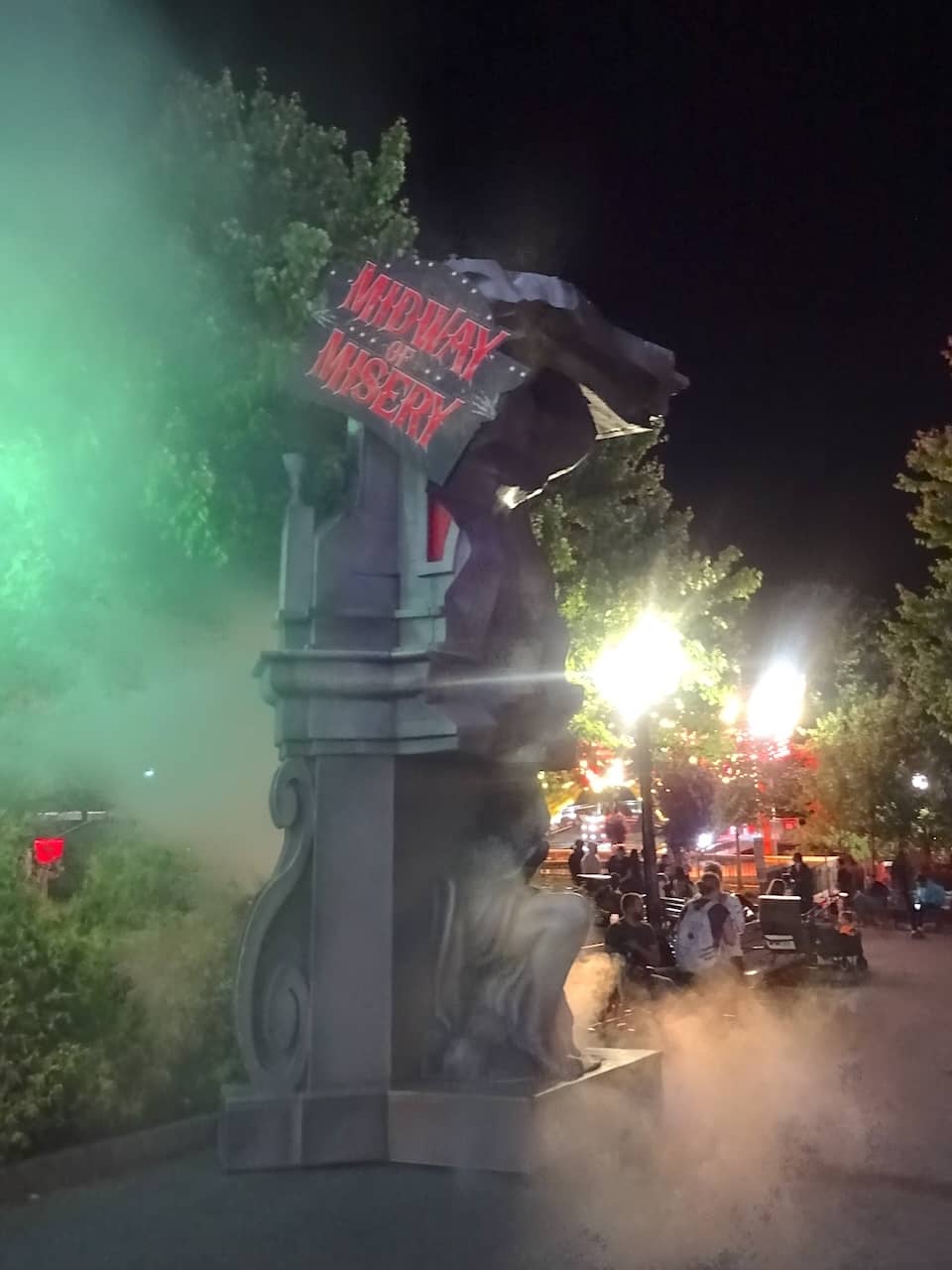 After leaving the catering area, we started roaming the park to ride some of the park’s coasters until the sun went down. As part of the media event, we were also invited to Spirits Bar near the front of the park just after sundown to sample one of their specialty cocktails. The bar can be accessed from inside the park but requires guests to go back through the main entrance to re-enter the park. (It’s connected to The Chocolatier restaurant, which can be accessed without a park ticket.) Spirits Bar has a laid-back vibe on an open rooftop with classic Halloween movies projected on one of the walls of an adjacent building. I tried the Graveyard Sunrise, which was presented with a smoke bubble topping the martini glass.