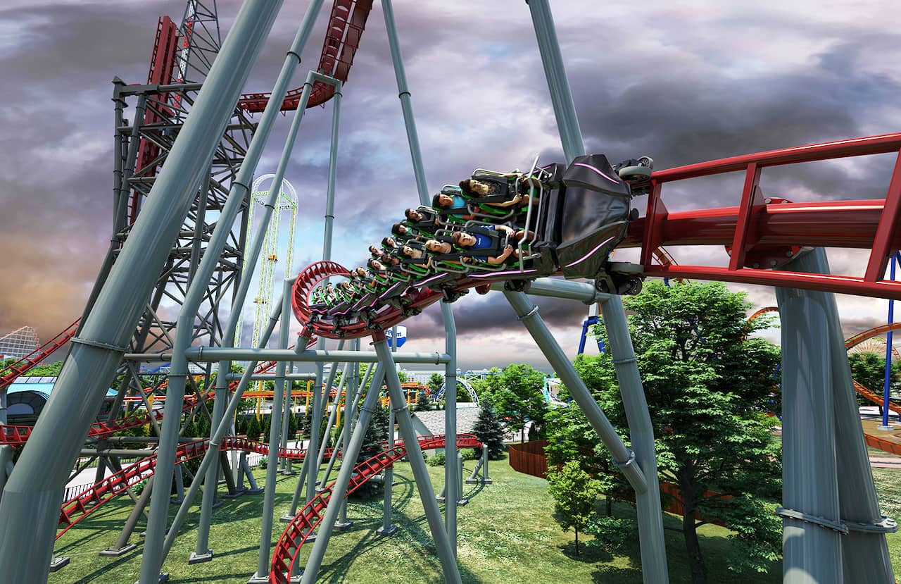 The 24-passenger trains will feature integrated audio and LED lighting. On the 2,966 feet of track, riders will reach a top speed of 58 mph as they experience two corkscrew inversions, 13 weightless airtime moments, and a high-speed "triple-down" element with twisted and overbanked track.