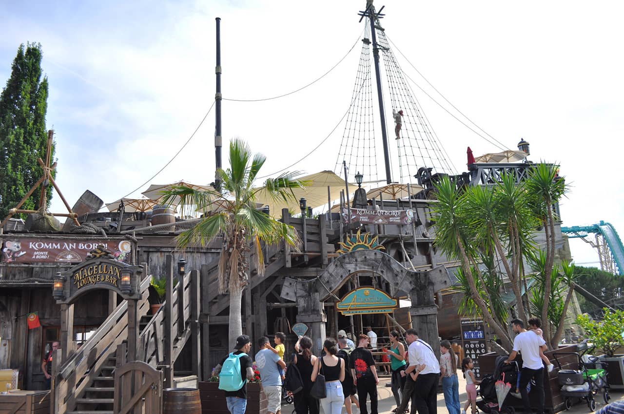 The area surrounding the entrance to the ride and the queue itself are extremely well themed with a massive pirate ship doubling as a bar anchoring the space, but this water coaster is fairly bare-bones in theming when compared to Poseidon.