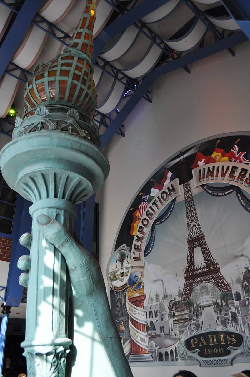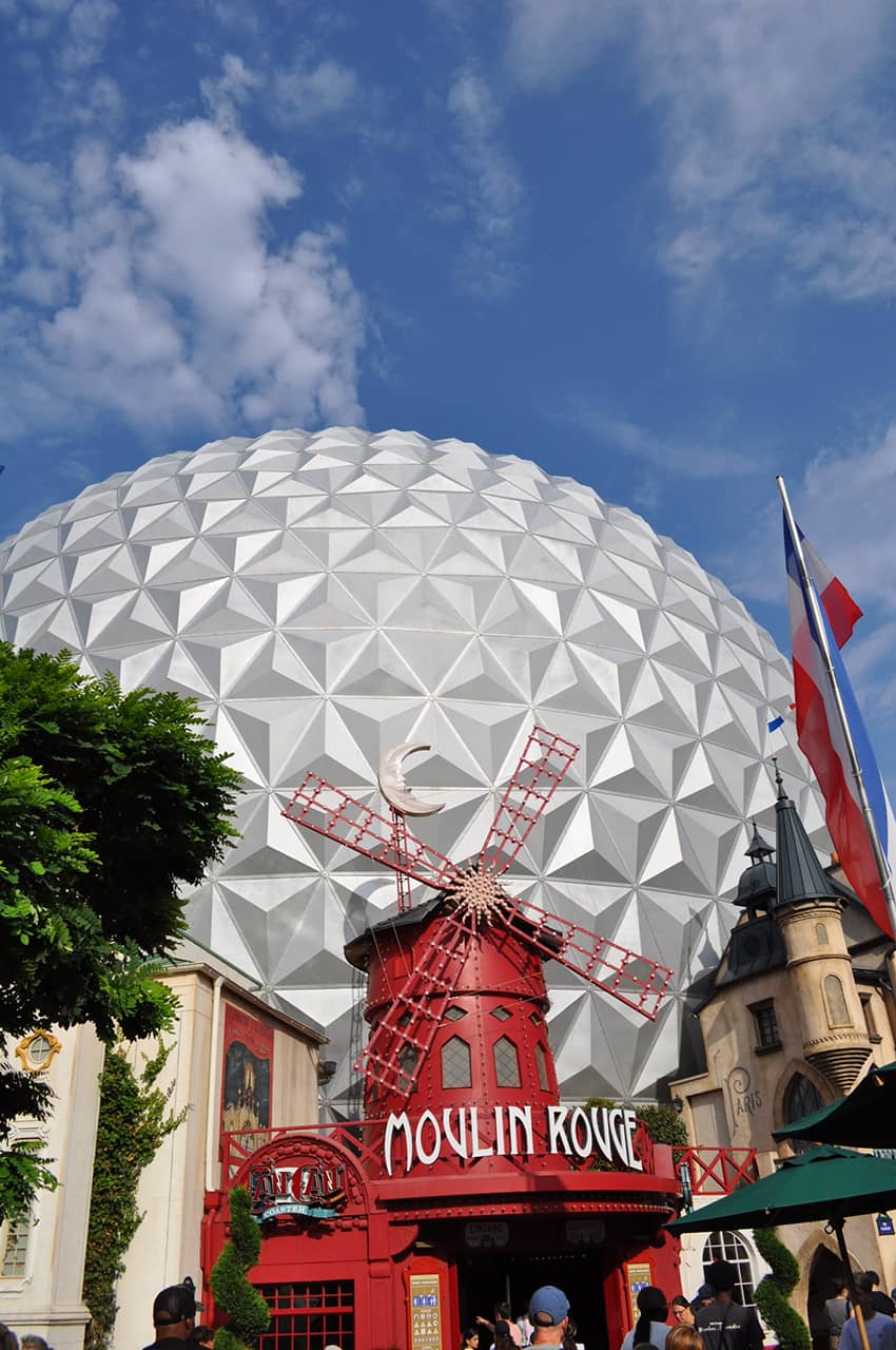 When you first approach this coaster located in the France area of the park, you might think you’re going to board Spaceship Earth, because this ride is located inside a massive geodesic sphere, though this one is not completely elevated off the ground like the one in EPCOT. Eurosat takes guests back to turn-of-the-century Paris with an entrance designed to look like the famous Moulin Rouge. The queue is intricately themed with lots of props and decorations to emphasize the theme.